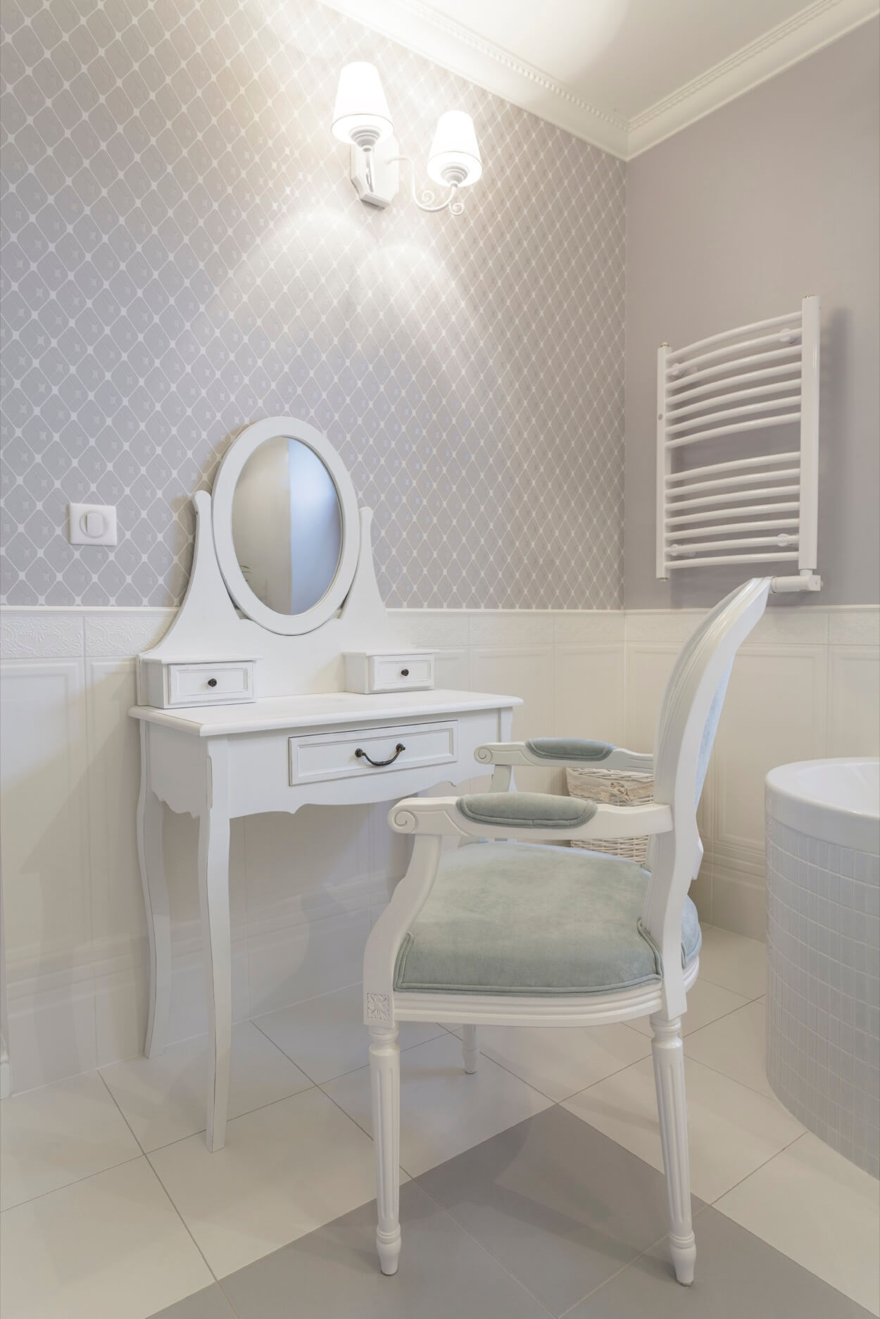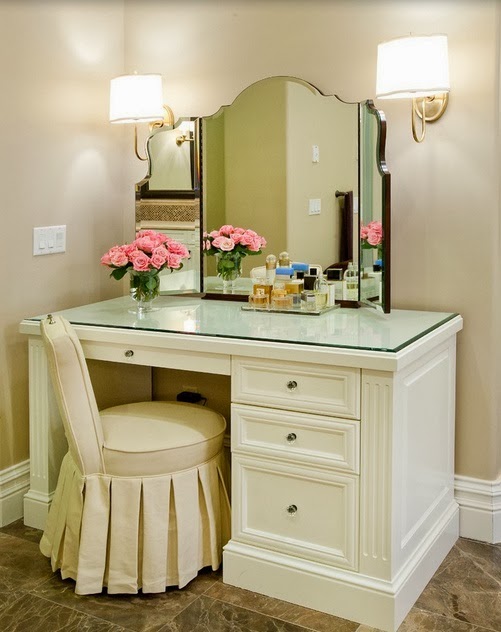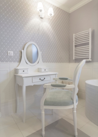 Diese Eigenschaft des Interieurs ist nur in großen Schlafzimmern vorhanden. Oft ist es in Form eines kleinen Schranks mit einem Spiegel ausgeführt. Hier können Besitzer mehrere Elektrogeräte (Fön, Epilierer, etc.) haben. Stellen Sie deshalb in der Nähe des Frisiertischs sicher, dass Sie eine Steckdose haben. Wenn die Anzahl der Werkzeuge ziemlich groß ist, ist es wünschenswert, diesen Wert auf 2-4 Teile zu erhöhen. Die Steckdose wird direkt über der Tischoberfläche in einer Höhe von mehreren Zentimetern montiert.