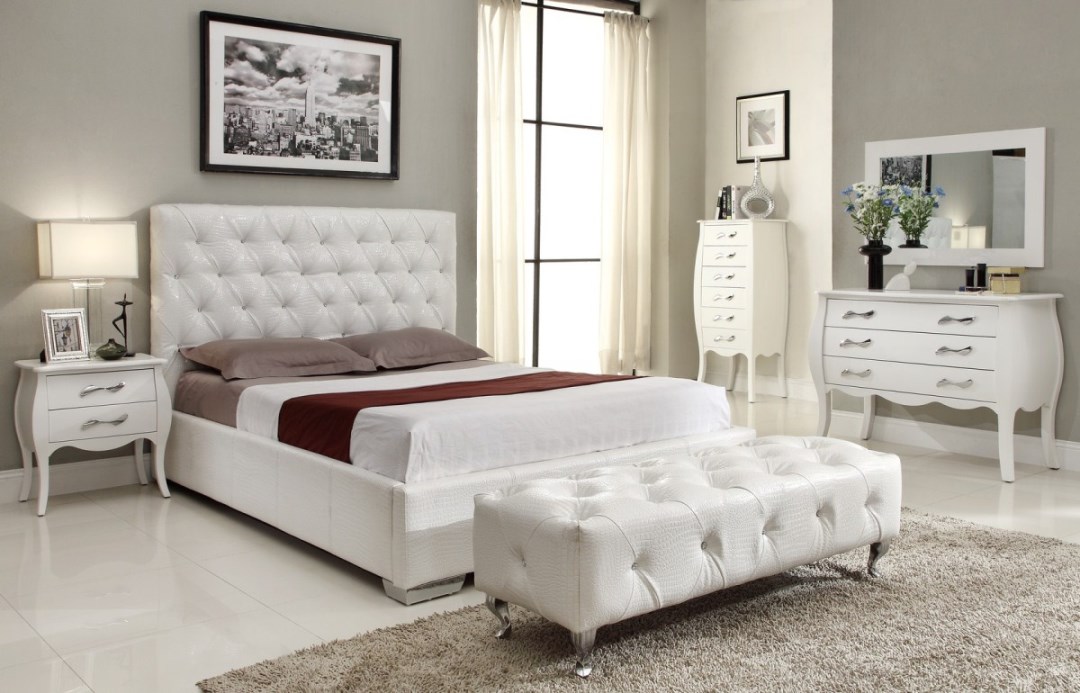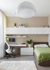 Wenn das Zimmer lang ist, stellen Sie einen Schrank vor dem Bett auf. Wenn es quadratisch ist, muss es auf der Seite platziert werden. Gegenüber dem Bett ist auch ein Nachttisch mit einem Fernseher und in den Beinen - ein Bankett platziert. Es ist besser, weiße Möbel zu verwenden - oder eine, die sich in den Boden einfügt. Berücksichtigen Sie, dass die Möbel der hellen Farbtöne die Decken optisch höher und dunkel machen - darunter.