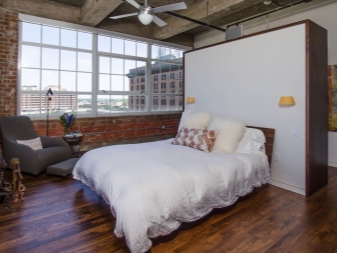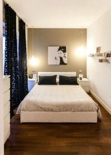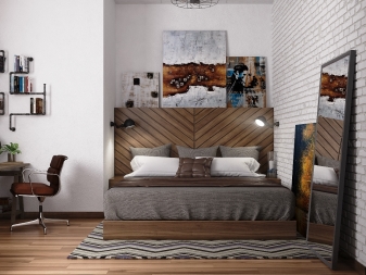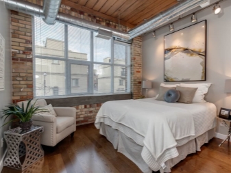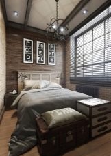 - Loft - Elemente dieses Stils können auch in das Innere eines kleinen Schlafzimmers einbezogen werden. Für die Wandverkleidung können Sie die Imitation von Mauerwerk verwenden. Stellen Sie ein Bett, das keine Beine hat. Keine Notwendigkeit, den Boden mit Teppichen zu dekorieren. Es sollte fast keine dekorativen Details in der Gestaltung dieses Raumes geben. Sie können einen Spiegel in einem dünnen Rahmen, strenge Lampen, mehrere schwarze und weiße Akzente verwenden. Die Leute in diesem Raum sollten den Eindruck haben, dass Sie vorübergehend hier sind und nicht verweilen werden.