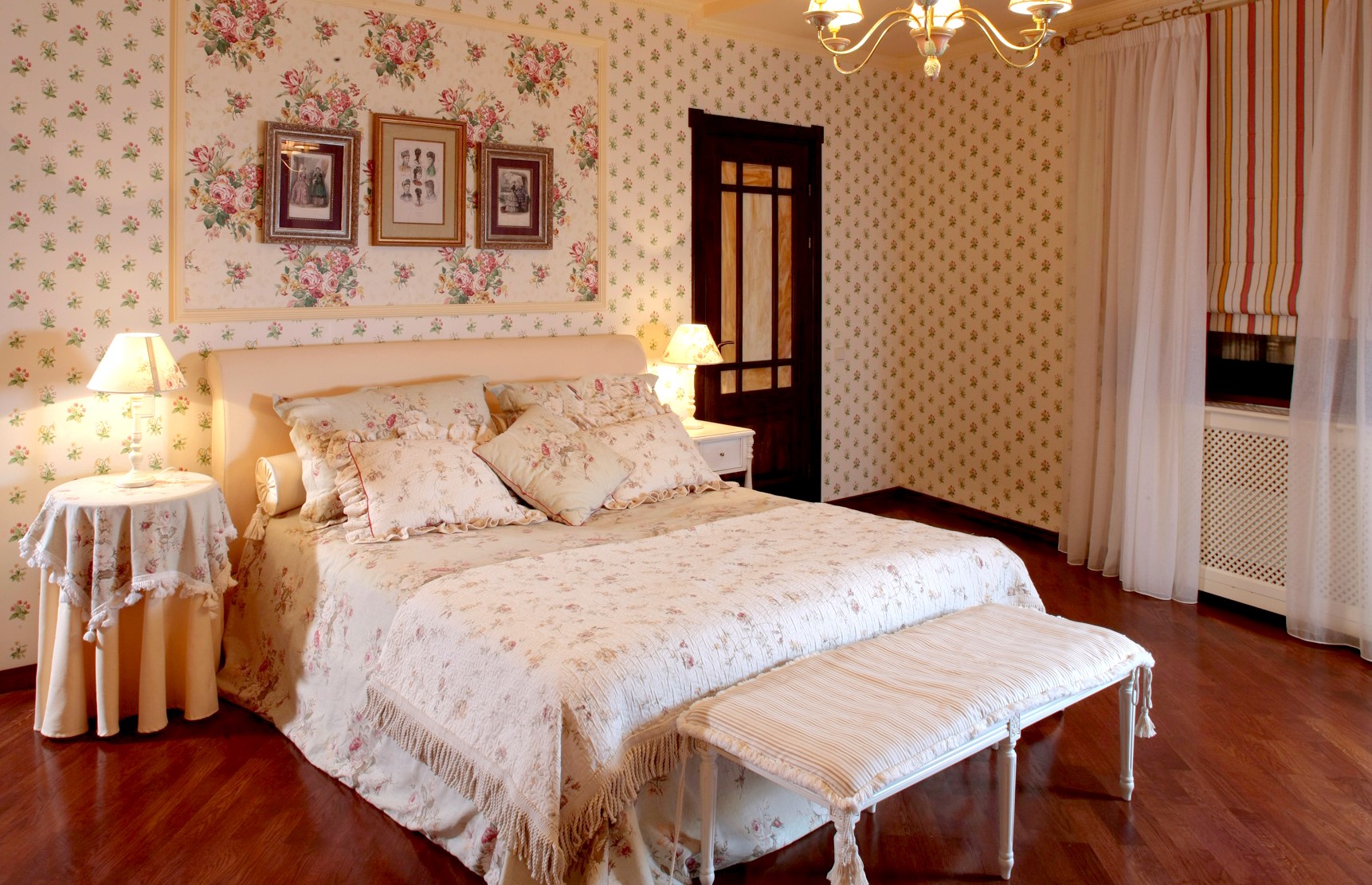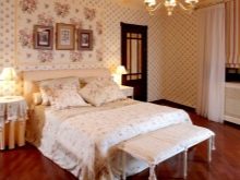 - Provence - ermöglicht es Ihnen, sich auf Romantik einzustellen. Alle Elemente in der Gestaltung des Raumes sollten in Pastellfarben hergestellt werden - zum Beispiel in weiß und blau, hellrosa, blass lila, beige und nicht sehr hellgrünen Farben. Textilien sollten mit einem kleinen Blumenmuster, kleinen Erbsen, Diamanten oder einem Käfig verziert werden. Für die Anordnung des Schlafzimmers ist es besser, Möbel aus einer einfachen Form zu verwenden, die aus hellem Holz oder weiß gestrichen sind.