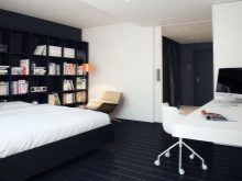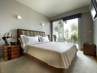 - Moderner Stil beinhaltet die Verwendung von klaren Linien, diskrete Farben und ein Minimum an Elementen. Für die Anordnung der Schlafzimmer verwendeten Möbelgarnituren, ohne jegliche Dekorationen. Wände und Decke können in Weiß-, Grau- oder Beigetönen ausgeführt werden. Als Bodenbelag wird Teppich, Laminat oder gedämpftes Parkett verwendet.