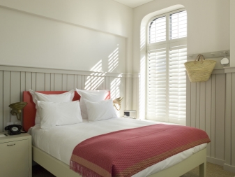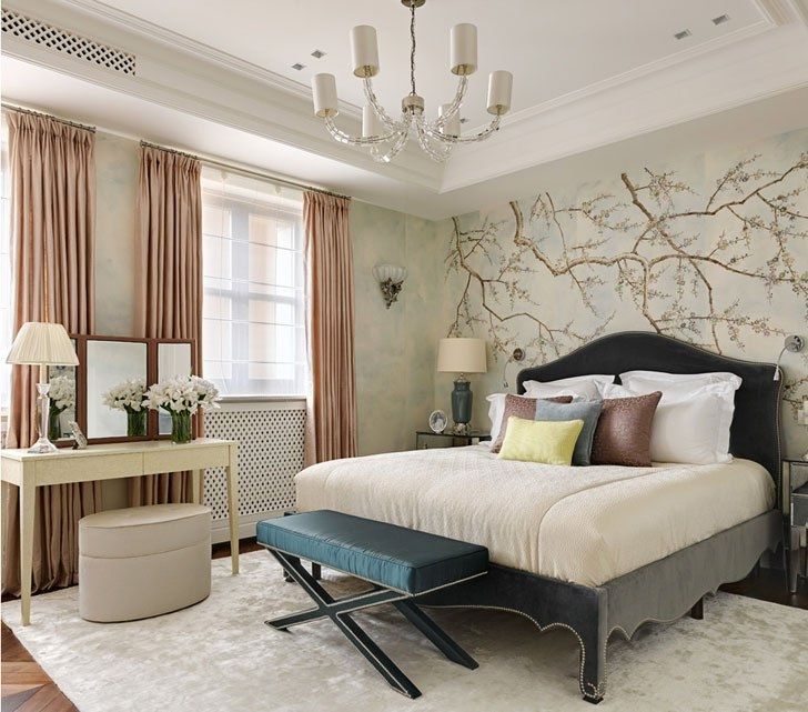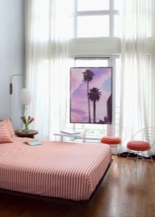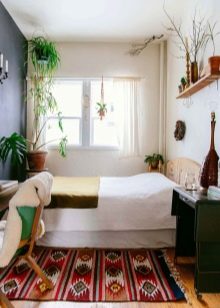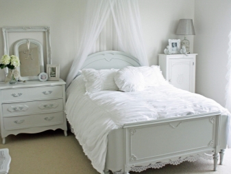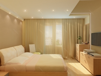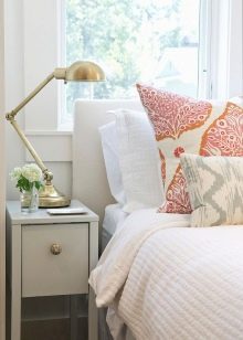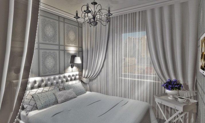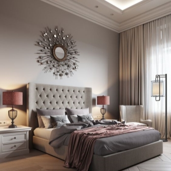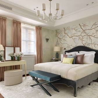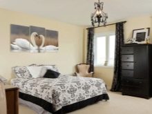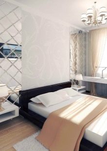 Um den Raum zu erweitern und die Sonneneinstrahlung zu erhöhen, werden Chromgriffe, Spiegelflächen und poliertes Holz verwendet. Als zusätzliche Elemente können exquisite Gemälde aufgehängt werden. Elegante Stehlampen oder Keramikfiguren, verschiedene Topfpflanzen werden verwendet. Bettwäsche ist besser, Seide oder Baumwolle zu wählen, ohne große Muster. Um eine friedliche Atmosphäre zu schaffen, können Spotlights in der gesamten Umgebung und Wandlampen verwendet werden, die sich auf den Nachttischen befinden.