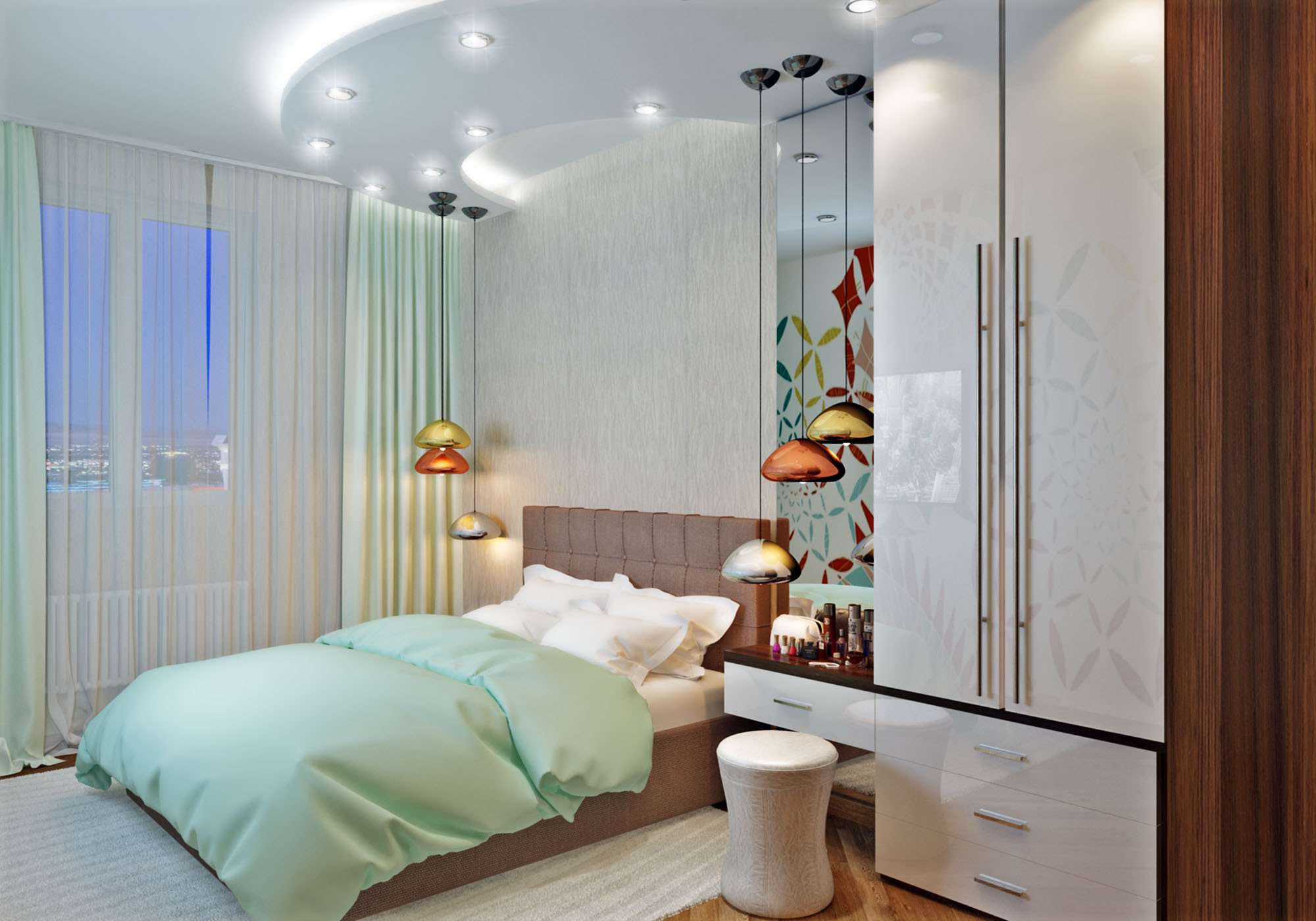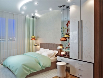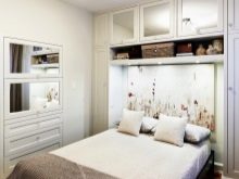 Die Reparatur in einem kleinen Schlafzimmer erfordert Phantasie und Phantasie. Wenn alles richtig geplant ist, passen die notwendigen Elemente eines Möbelsets problemlos in einen kleinen Bereich.