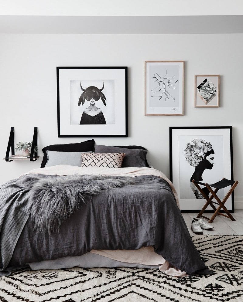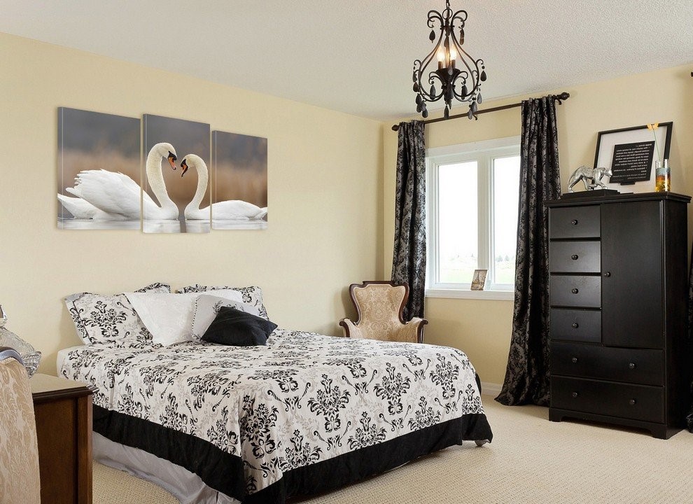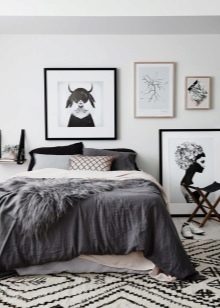 Machen Sie Bilder, Spiegel und Fotos, verwenden Sie einfache Rahmen., nicht mit zusätzlichen Elementen gewichtet. Machen Sie keine Galerie aus dem Schlafzimmer, ein Bild wird ausreichen.Wenn Sie an ein Interieur ohne Fotos denken, dann ordnen Sie sie horizontal an, wenn hohe Decken im Raum oder in mehreren vertikalen Reihen sind - für einen Raum mit niedrigen Decken.