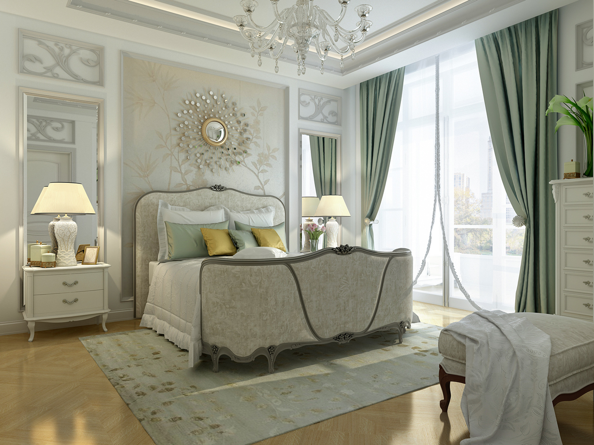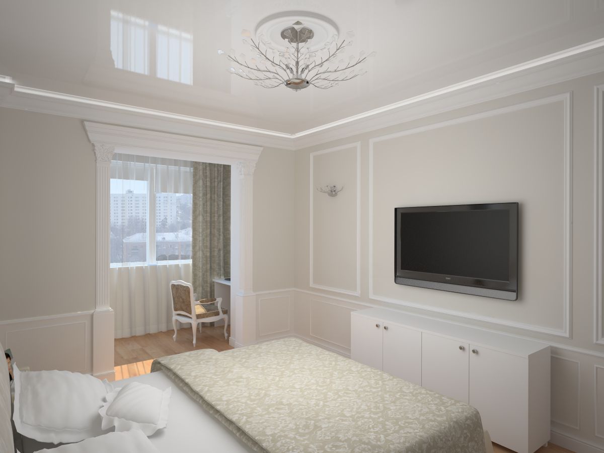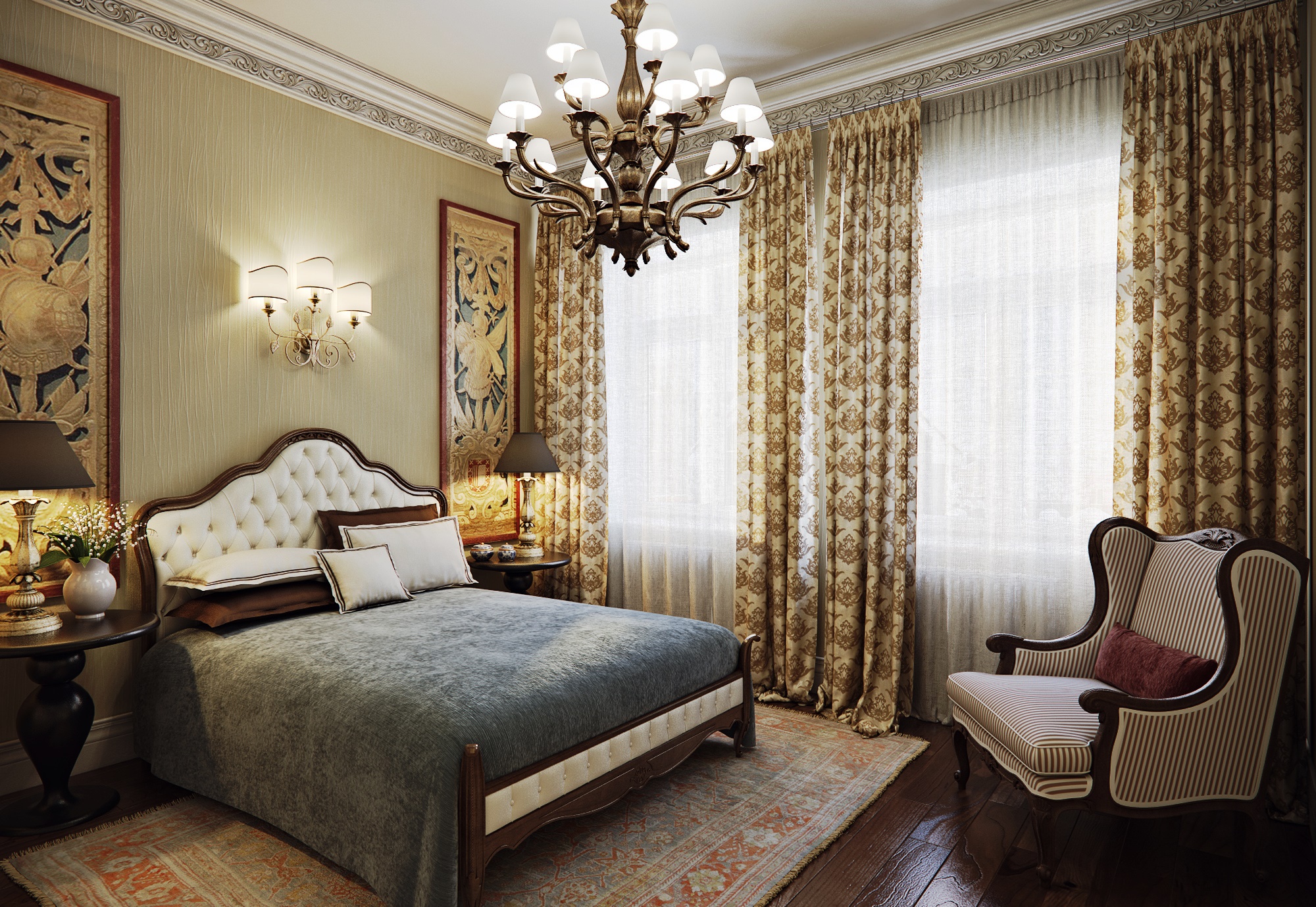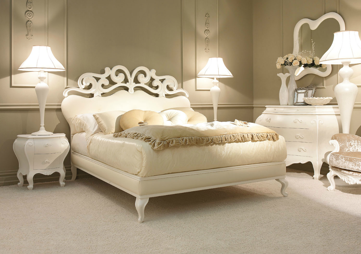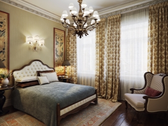 - Klassisch Es wird eine ideale Option für Liebhaber und Kenner von Luxus-Optionen sein. Zarte Töne (weiß, rosa, blassviolett) sind in perfekter Harmonie mit dem Silber-Gold-Dekor, Stuckleisten, Säulen und Lampen aus Kristall. Geschnitzte Möbel, in weißer Farbe lackiert, sorgen für eine schicke Atmosphäre. An den Fenstern sollten Sie massive Brokat-, Satin- oder Samtvorhänge hängen, die der Farbgebung des Raumes entsprechen. Aus diesen Stoffen ist es auch möglich, einen Baldachin für ein Bett zu nähen. Die Anwesenheit einer großen Menge an Licht wird helfen, aus einem kleinen Raum ein echtes königliches Schlafzimmer zu machen.
