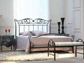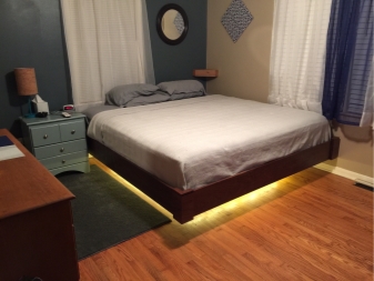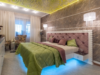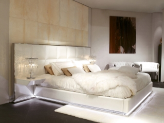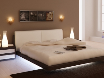 Um das Bett "Luft" zu machen und seine Massivität zu minimieren, können Sie die Unterseite der Diodenbeleuchtung ausstatten. Der Liegeplatz sollte am günstigsten Platz sein.Vergessen Sie nicht, Platz für Beistelltische zu lassen, etwa 40-60 cm.
