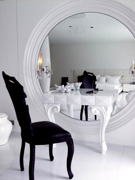 - Platzieren Sie einen großen Schminktisch an den Seiten des Bettes.Diese Technik wird auch für die visuelle Erweiterung des Raumes verwendet.