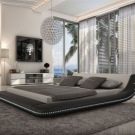 Dieses Schlafzimmer kombiniert modernen Stil und klassische Farben. Solch ein Design des Schlafzimmers ist perfekt für alle Liebhaber des Minimalismus Stil.Ein einfaches breites Bett ist nur mit stilvoller Bettwäsche und bequemen dekorativen Kissen dekoriert.