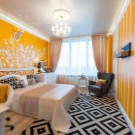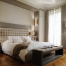 Designer empfehlen, ein Bett gegenüber dem Eingang zu installieren. Dies ist sehr praktisch, da in diesem Fall ein heller Akzent über dem Kopfteil angebracht werden kann. In diesem Fall wird es Sie nicht ablenken oder ärgern, sondern einfach nicht viel freien Platz im Raum hinzufügen, Sie können mit einer einfacheren Version des Raumes durchkommen und es stilvoller gestalten.