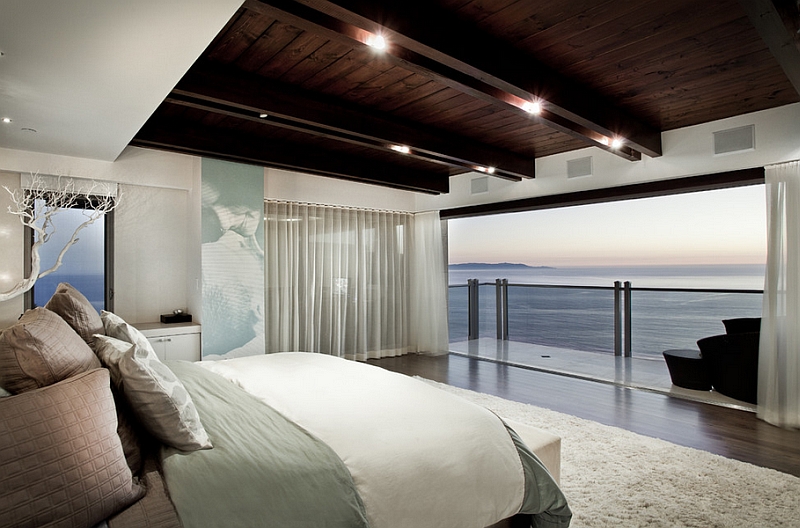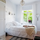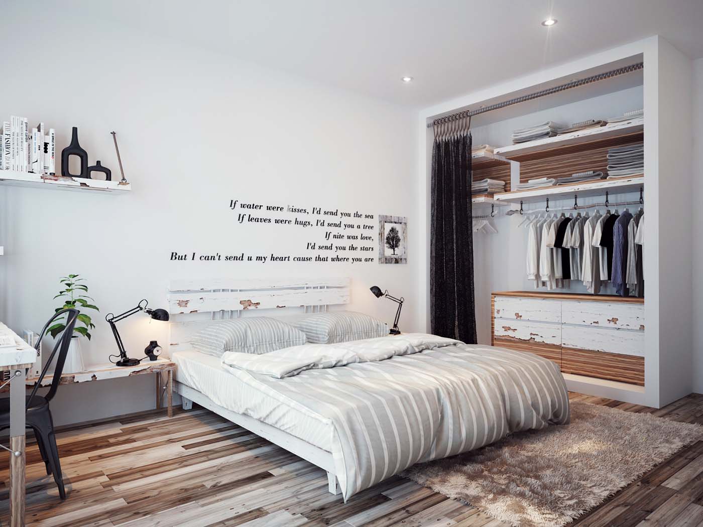 Einer der bemerkenswertesten Stile ist Skandinavisch. Es zeichnet sich durch den Einsatz von hellen Farben und natürlichen Materialien aus.Am häufigsten finden Sie in einem solchen Schlafzimmer Möbel aus Naturholz und vielen Glasflächen. Glas macht den Raum heller und Holz belebt das Interieur und macht den Raum komfortabler.