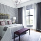 Um einen solchen Raum zu gestalten, benötigen Sie keine komplexen Komponenten. Ein großes schönes Bett in diesem Raum ist der Hauptakzent. Es ist mit einem gestreiften Plaid verziert, das die Basis des Raumes und Vorhänge miteinander verbindet. Über dem Bett befindet sich eine zusätzliche Beleuchtung, die nicht nur die richtigen Akzente setzt, sondern auch den Raum stilvoller und komfortabler macht.