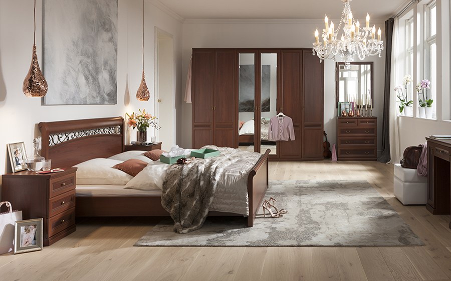 Dieser Stil zeichnet sich durch den Einsatz teurer Materialien oder zumindest ihrer Nachahmung aus. Idealerweise ist ein Schlafzimmer im klassischen Stil eine Fülle von Holz, teuren, dichten Stoffen und interessanten Mustern, die sowohl Wände als auch Textilien schmücken. In solch einem Innenraum werden schöne Gemälde in schweren Rahmen nützlich sein. Egal, die Reproduktion ist eine berühmte Leinwand oder die Kreation eines jungen Künstlers - die Hauptsache ist, dass sie in den Stil des Raumes passt.