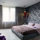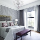 Weiter sehen Sie die Idee eines interessanten Designs eines Raumes mit einer Kombination von drei Arten von Tapeten grauer Farbe mit verschiedenen Texturen, sowie Funktionen der Wahl der Textilien für das Innere des Schlafzimmers in Grautönen.