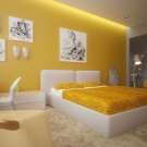 - Gelb Am häufigsten von Designern für die Wände des "nördlichen" Schlafzimmers verwendet. Die Kombination ist warm bzw. gemütlich, im Schlafzimmer herrscht eine ruhige und gemütliche Atmosphäre.