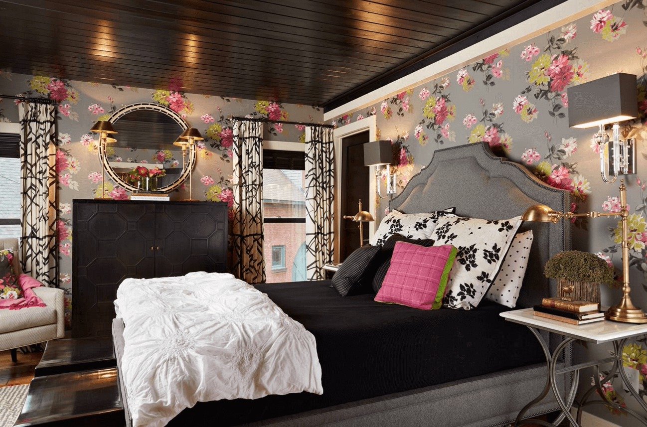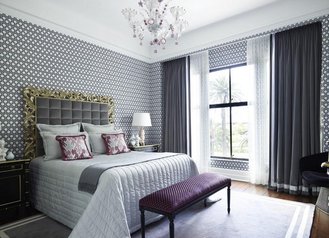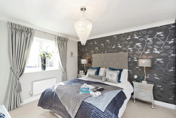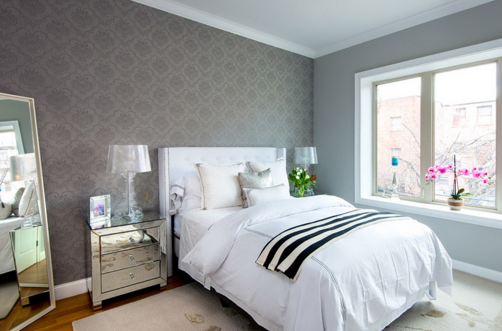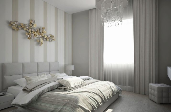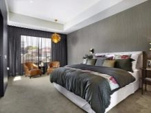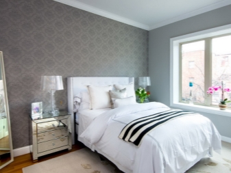 Die Farbsättigung wirkt sich auf die Farbtiefe aus, in der Natur gibt es also Hellgrau, Neutralgrau und Dunkelgrau. Mit einer Kombination verschiedener Schattierungen können Sie ein schönes monochromes Muster erstellen. Tapeten mit einfarbigen Mustern werden harmonisch in das Innere des Schlafzimmers schauen, besonders wenn Sie an den Fenstern dunkelgraue Vorhänge hängen.