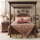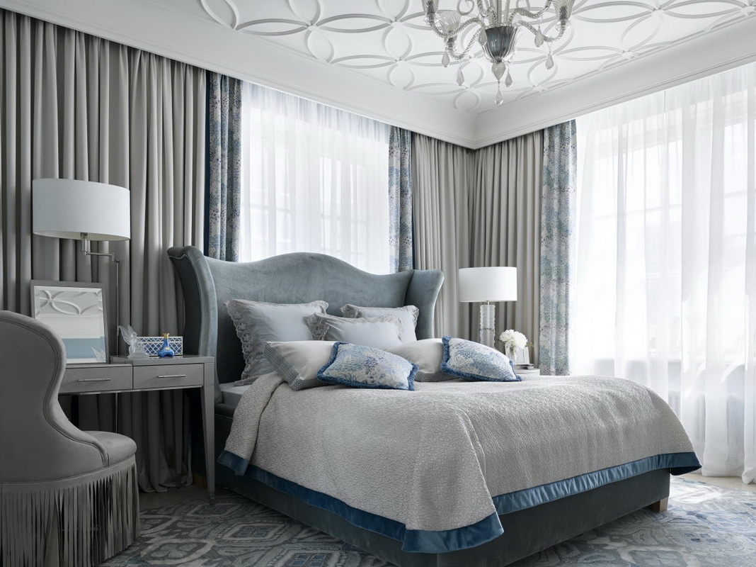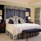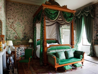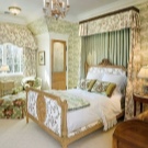 Der Stoff im englischen Schlafzimmer sollte in großen Mengen vorhanden sein. Ohne luxuriöse Textilien wird das Design unvollendet sein. Die Bettwäsche wird vorzugsweise aus Seide mit Blumenmustern ausgewählt. Tagesdecke und Kissenbezüge sollten mit allen Verzierungen kombiniert werden. Ein wichtiges Element der Einrichtung - Vorhänge. Sie sollten lange mit schönen Wellen gefaltet sein. Bei der Auswahl ihrer Farben sollte sich das Muster von Tapeten oder geprägten Polstern orientieren.