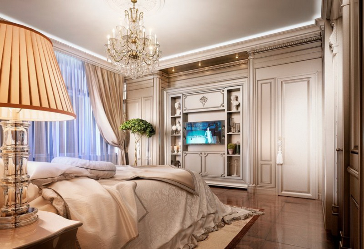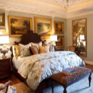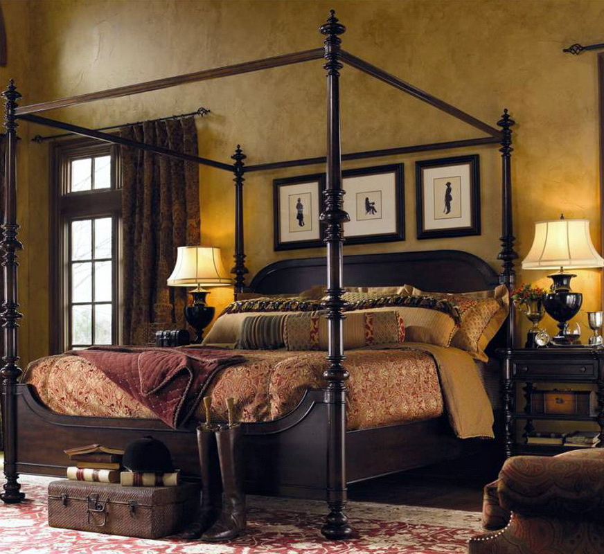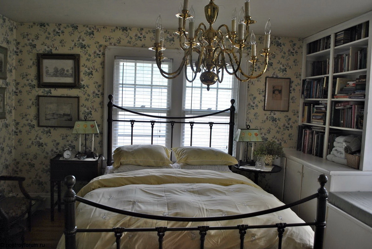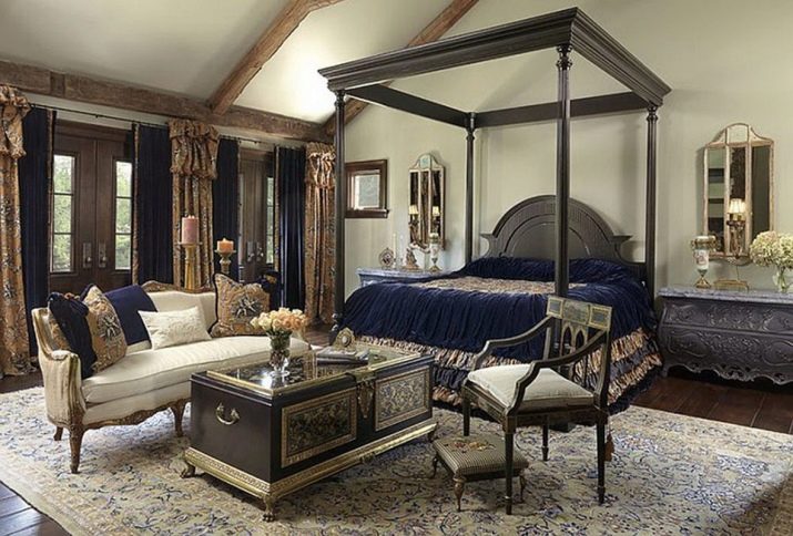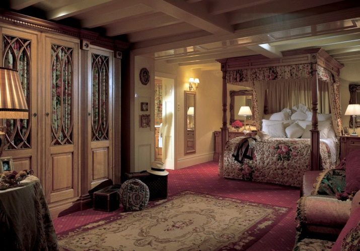 Natürlich wird in jedem Schlafzimmer der zentrale Platz dem Bett gegeben. Es sollte groß und massiv sein. Verschiedene geschnitzte Elemente, ein Baldachin, Kissen in großen Mengen dienen als Dekoration. Neben dem Bett sind Nachttische und eine Kommode mit Spiegel. Ein großer Kleiderschrank aus Holz ist ein weiteres integrales Element des englischen Schlafzimmers. Englisches Schlafzimmer kann ohne Kamin nicht vorgestellt werden. Im Idealfall sollte es real und mit Brennholz beheizt werden. Aber in der Wohnung kann es durch eine elektrische oder sogar seine Nachahmung ersetzt werden.
