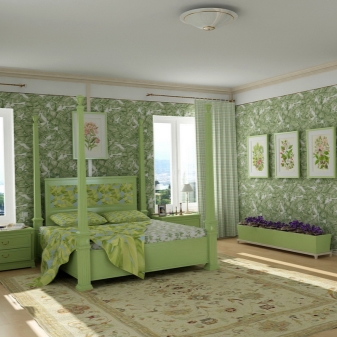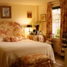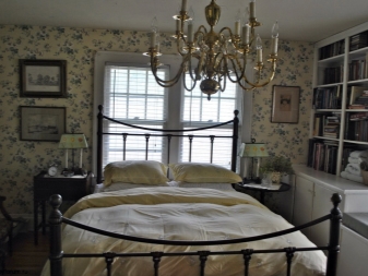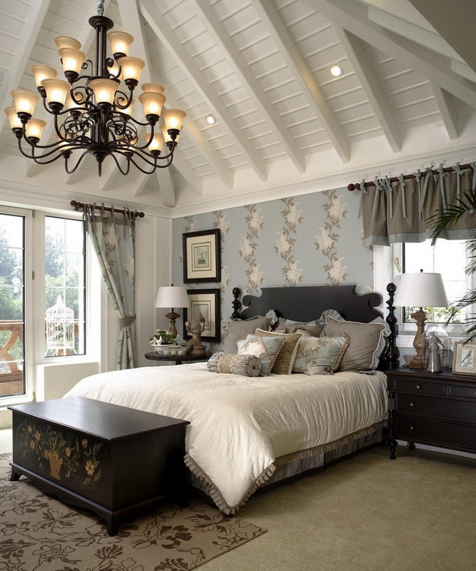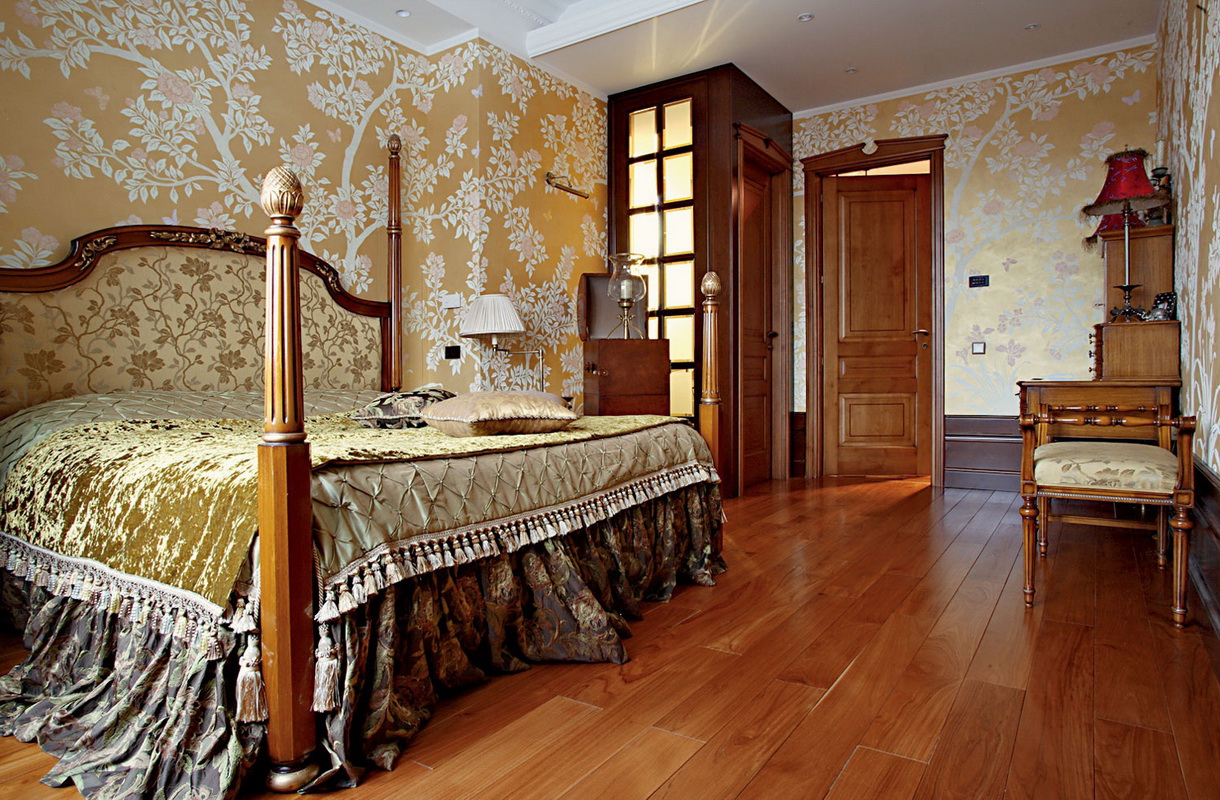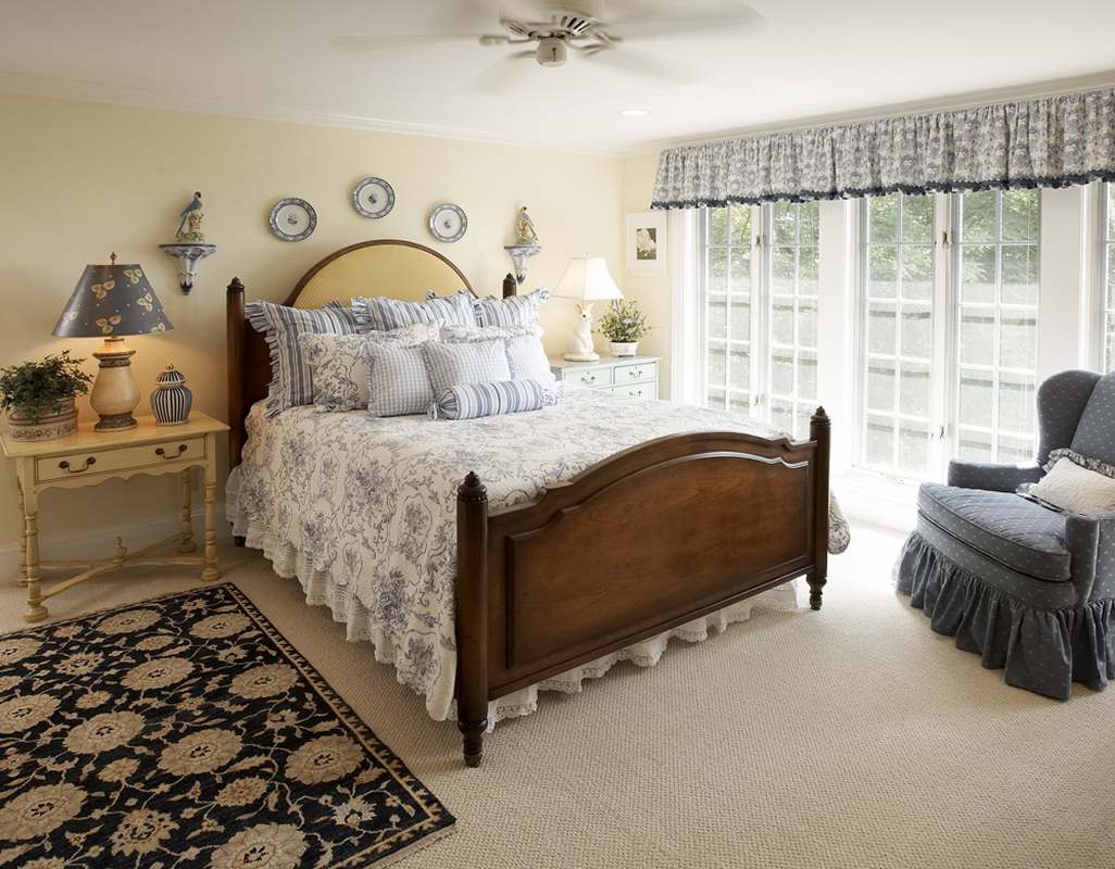 Der Boden besteht vorzugsweise aus Holz. Es ist sehr wünschenswert das Vorhandensein von strukturierten Holzmuster auf dem Boden. Holzflecken werden oft auf den Boden aufgetragen, damit sie dunkler erscheinen. Es ist ein dunkler dunkler Boden, der für das englische Schlafzimmer charakteristisch ist. Das Vorhandensein eines Teppichs aus zarten gedämpften Tönen mit einem floralen oder geometrischen Muster ist zulässig.Ideal für ein englisches Schlafzimmer - weiße Decke, mit Bordsteinen oder Leisten verziert. Sie können auch in Holzbalken verwendet werden, die entweder weiß gestrichen werden oder eine natürliche Farbe hinterlassen, die zum Farbton von Möbeln und anderen Accessoires passt. Sowohl die Tür als auch die Fenster sollten aus Holz sein. Ein großes Fenster ist normalerweise in kleine Rechtecke unterteilt. Türen sollten nicht aufschwingen und sich bewegen.