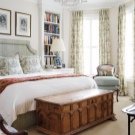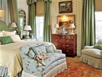 Sessel sollten im Schlafzimmer mit englischem Interieur vorhanden sein. Sie werden zum Fenster neben dem Kamin oder Bücherregal gestellt. Hier können Sie einen kleinen Tisch oder eine Stehlampe platzieren. Für die Polsterung von Polstermöbeln wählen Sie am häufigsten Leder oder Samt.Wenn es die Raumgröße erlaubt, können ein Bücherregal oder Regale über dem Bett im Schlafzimmer platziert werden. Dies steht im Einklang mit der englischen Tradition des Lesens vor dem Schlafengehen. Ein kleines Sofa oder Hocker gehört auch zu den Attributen des Schlafzimmers im englischen Stil.