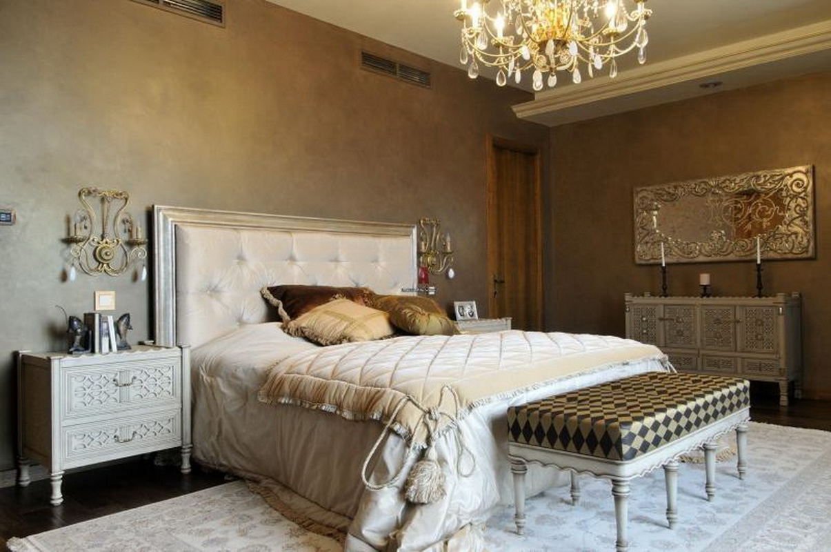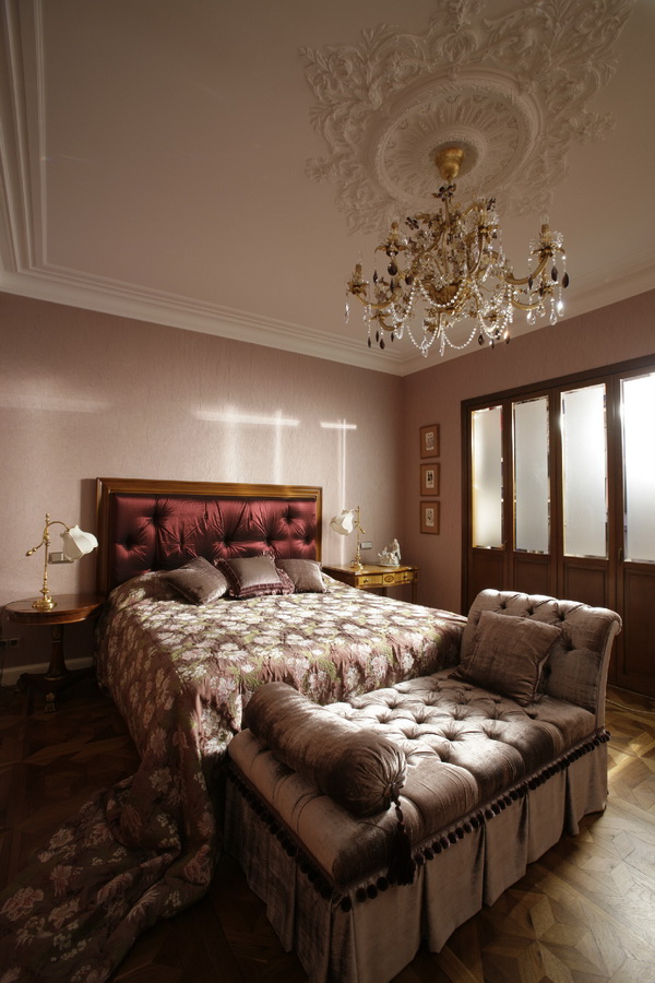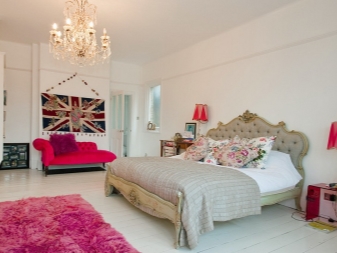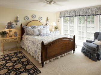 Der Teppich sollte natürlich sein, mit einem kurzen Nickerchen. Sie können einen Teppich in der Mitte des Raumes oder mehrere Decken neben dem Bett platzieren. Schlafzimmer-Design im englischen Stil erfordert viel Geld.