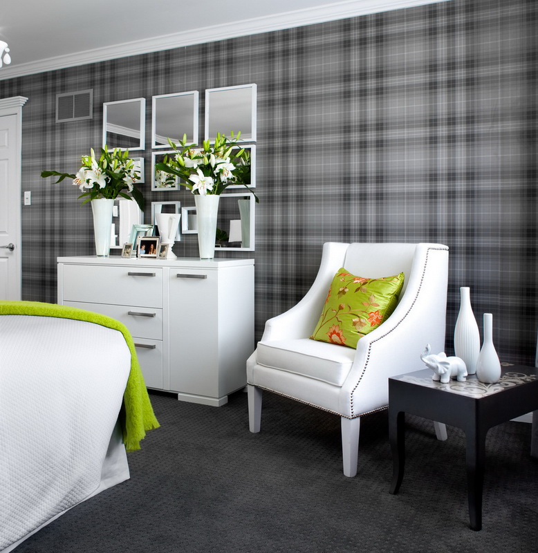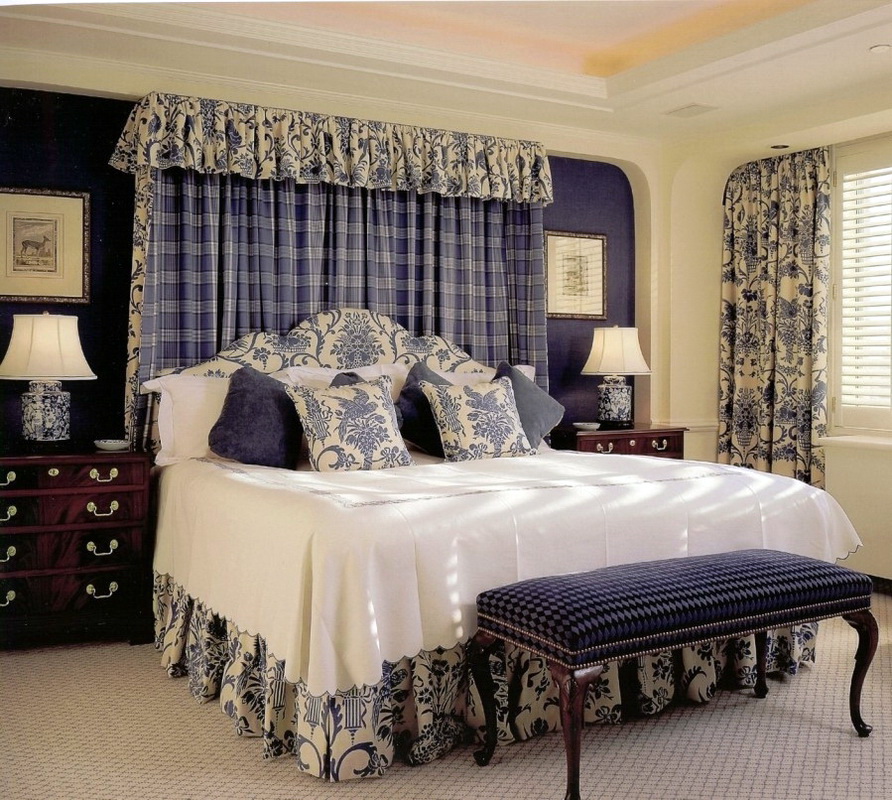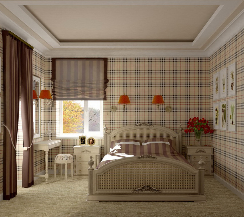 Manchmal als Ausnahme im Schlafzimmer im englischen Stil, können Sie die Wände eines Tones sehen. Aber in der Regel ist ein Blumendruck, ein Streifen oder eine schottische Zelle häufiger. In diesem Fall sollte die Tapete selbst teuer und robust sein. Sie können Stoffbeschichtungen, Siebdruck oder Prägung wählen. Eine Alternative zu den aufgeführten Beschichtungen kann Pastellfarbe für Wände sein, über die ein Ornament aufgetragen wird. Die Farbe der Wände sollte gedämpft und gedämpft sein. Der untere Teil ist mit Holzpaneelen verkleidet, wodurch die Wärme besser isoliert wird.
