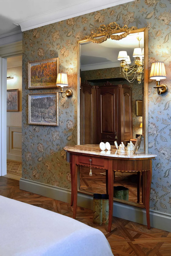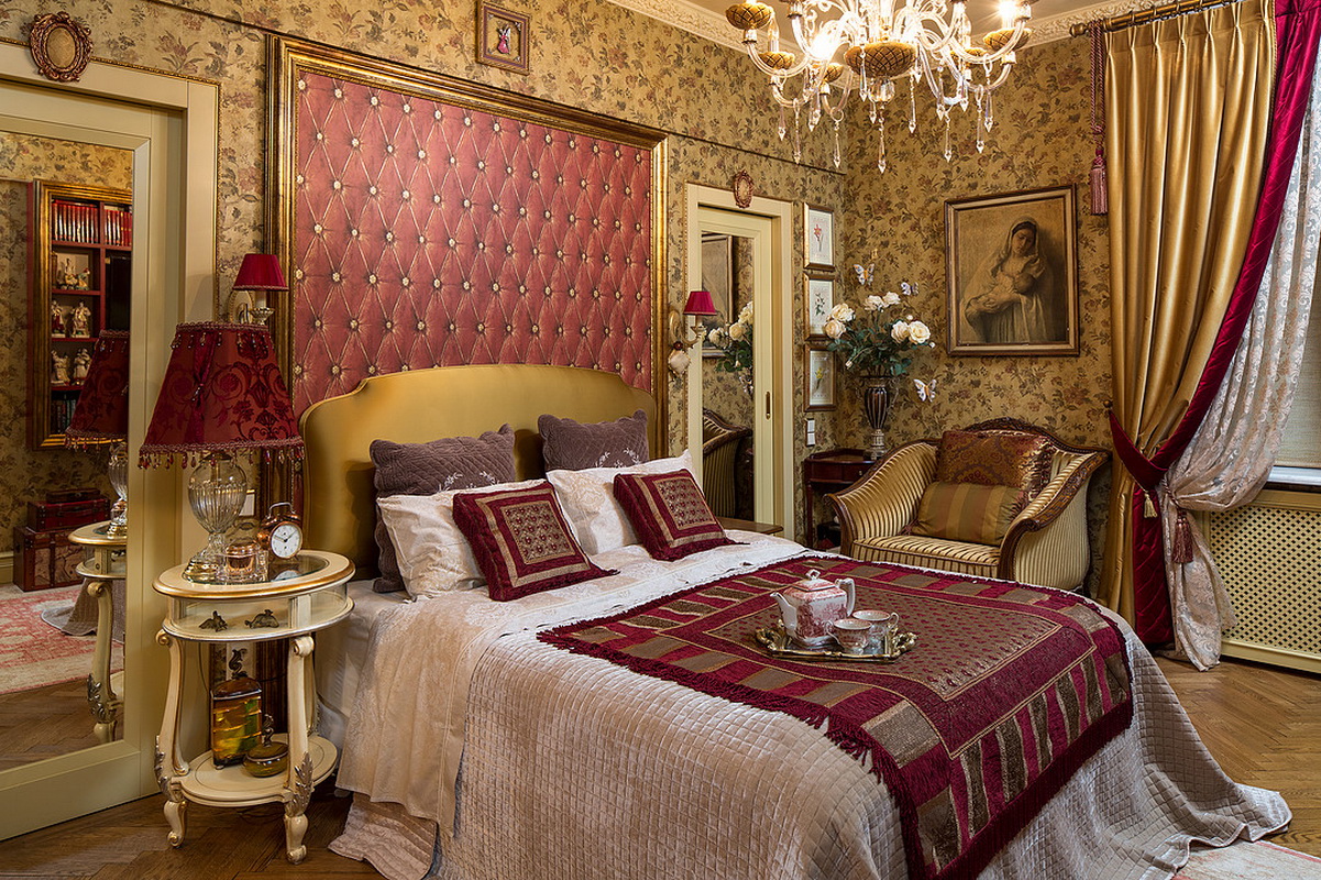 Hochwertige Textilien, Holz und antike Accessoires sind nicht billig.Falls gewünscht, kann es durch Verdünnen der modernisierten Gegenstände moderner gemacht werden.