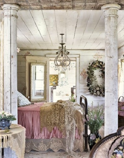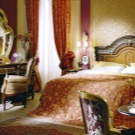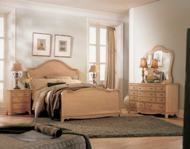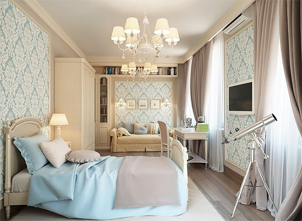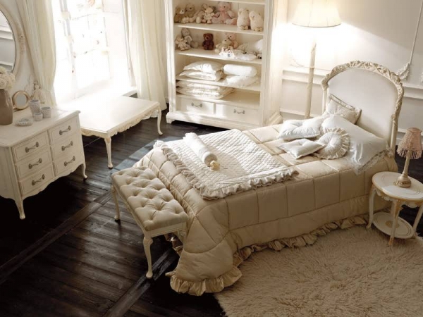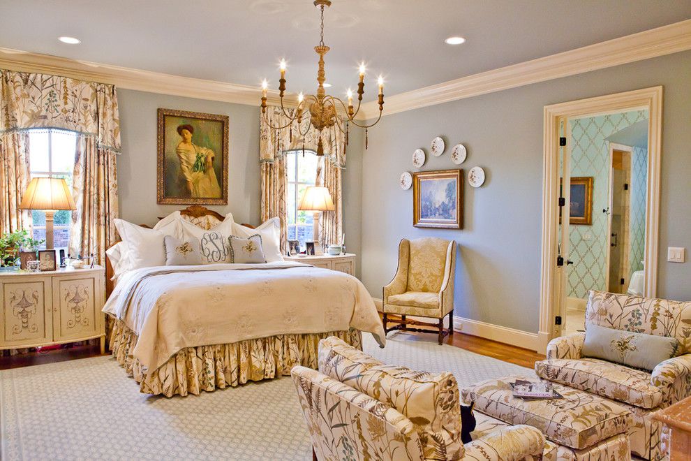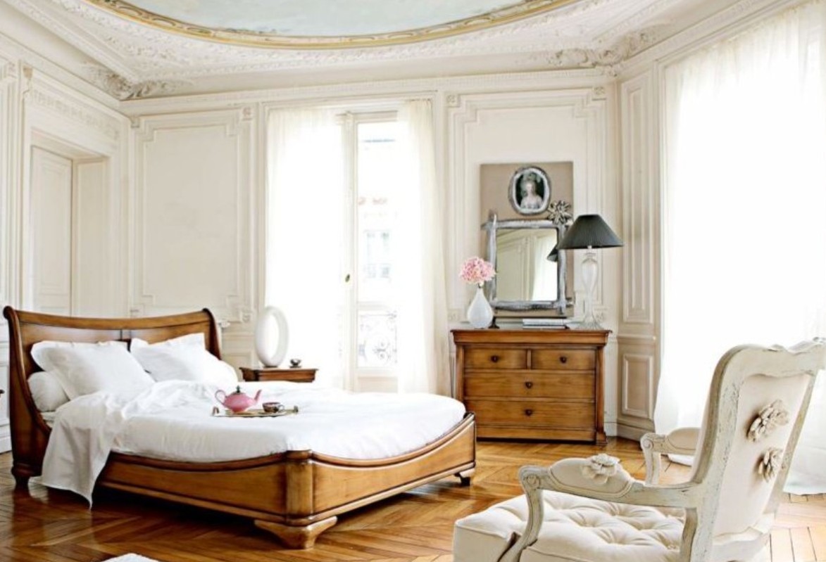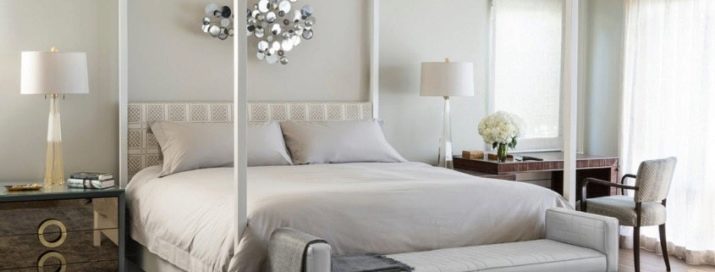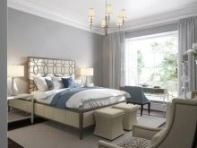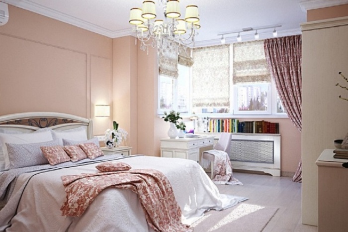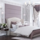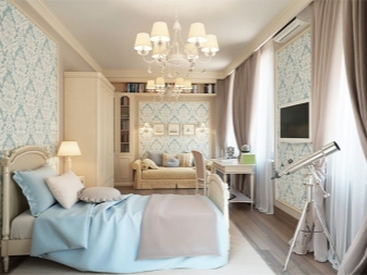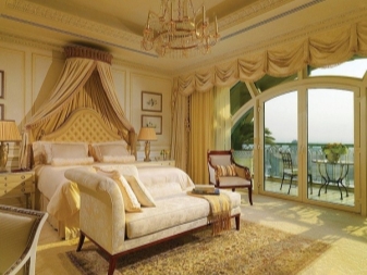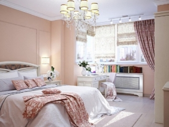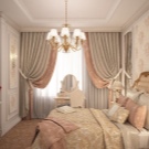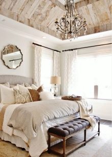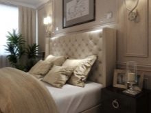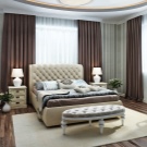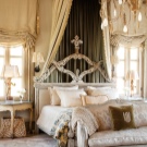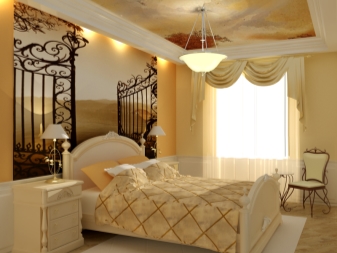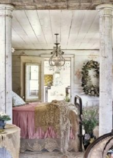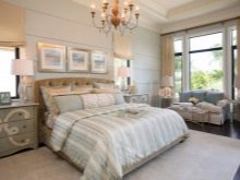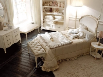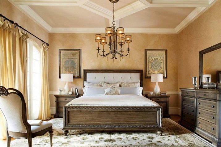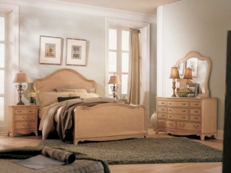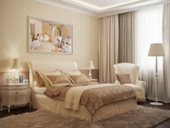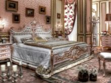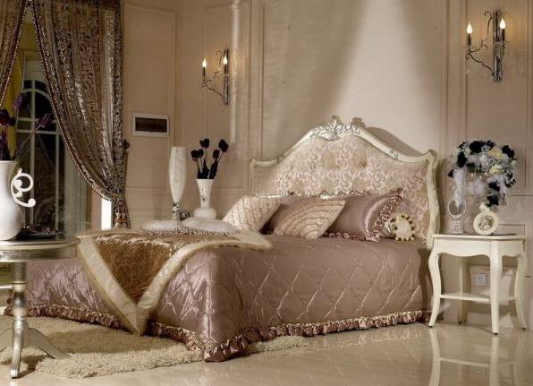 Möbel und dekorative Elemente sollten das Auge anziehen, daher sollte das Bett massiv und sicher aussehen, und sein Rücken sollte eine gemusterte Form haben. Schöne Nachttische mit Beinen werden spektakulär aussehen, und eine kleine Bankette wird dazu beitragen, das Interieur zu ergänzen. Die Fenster sollten einfache Vorhänge haben, die blau, rosa oder braun sein können. An den Wänden müssen Gemälde und Wandlampen gealtert sein.