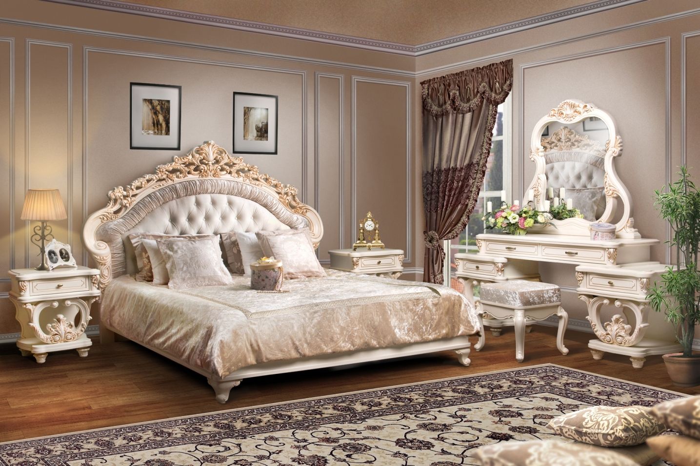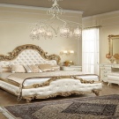 - "Madrid" - ein luxuriöses komfortables Schlafzimmer von der Marke "Eurasia"bestehend aus einem Bett, einer hohen Kommode, zwei Nachttischen, einem Schminktisch, einem Spiegel und einem gepolsterten Hocker. Alle Artikel sind im gleichen Farbschema gefertigt und kombinieren Elfenbein mit goldener Patina.