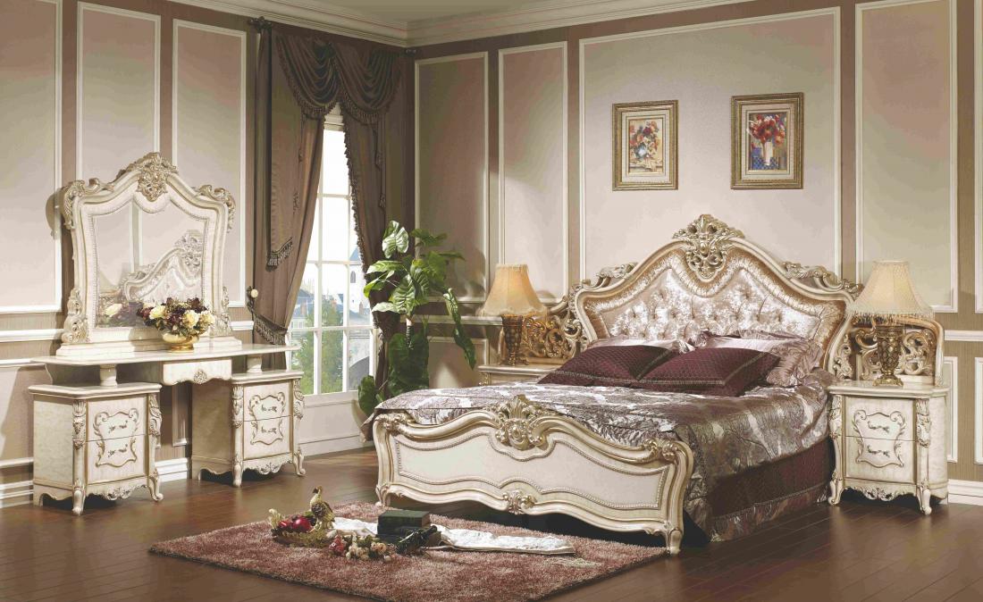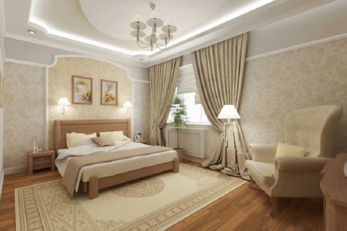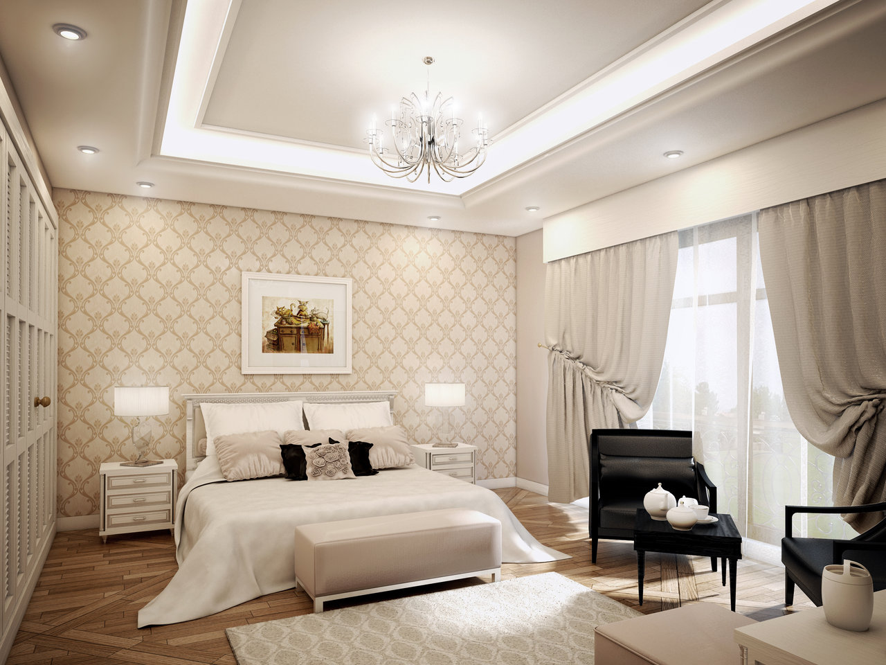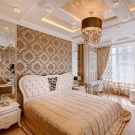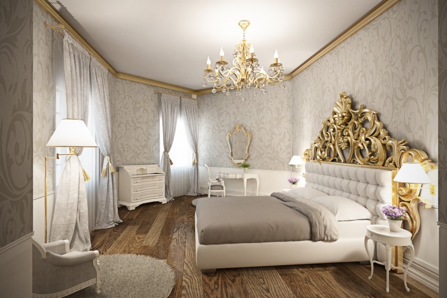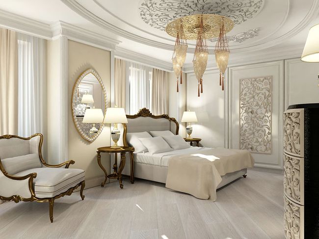 Machen Sie ein Schlafzimmer in der klassischen wichtigen Sache zu erinnern, dass der Raum Luxus und Wohlstand ausstrahlen sollte. Dafür müssen keine teuren Materialien wie Marmor verwendet werden.Sie können die verfügbaren Optionen verwenden. Die Wände können Tapeten eingeklebt werden, aber es ist wünschenswert, dass sie eine weiße oder beige Farbe mit Goldmalerei haben. Es ist am besten, ein Laminat zu verlegen, das Holz auf dem Boden imitiert, und die Decke kann weiß gestrichen werden.
