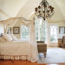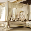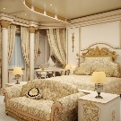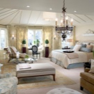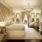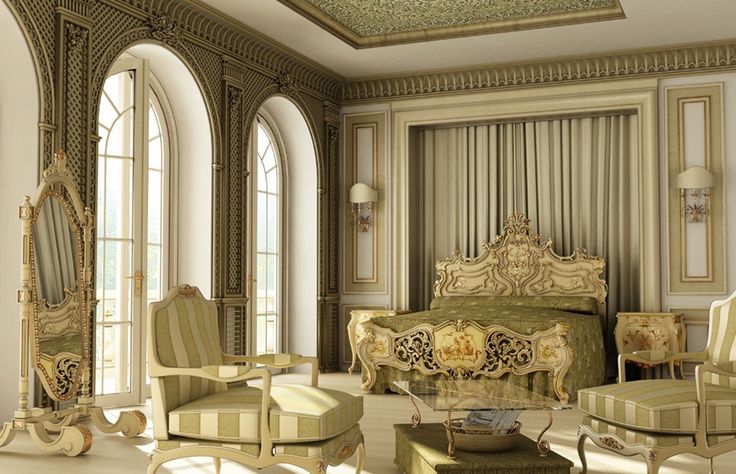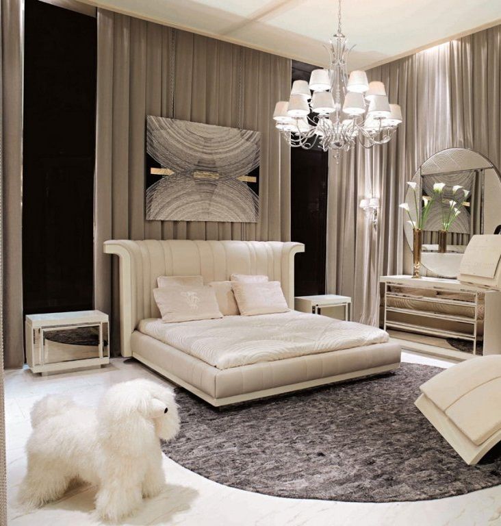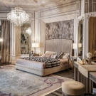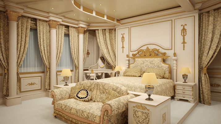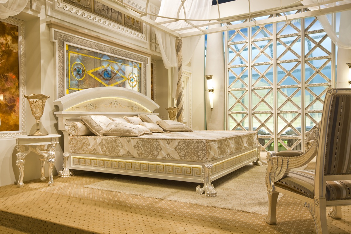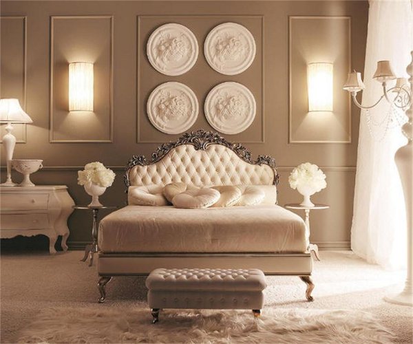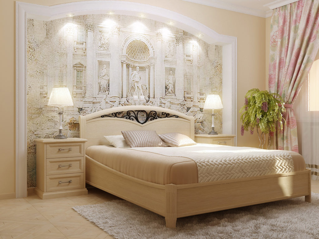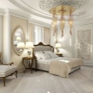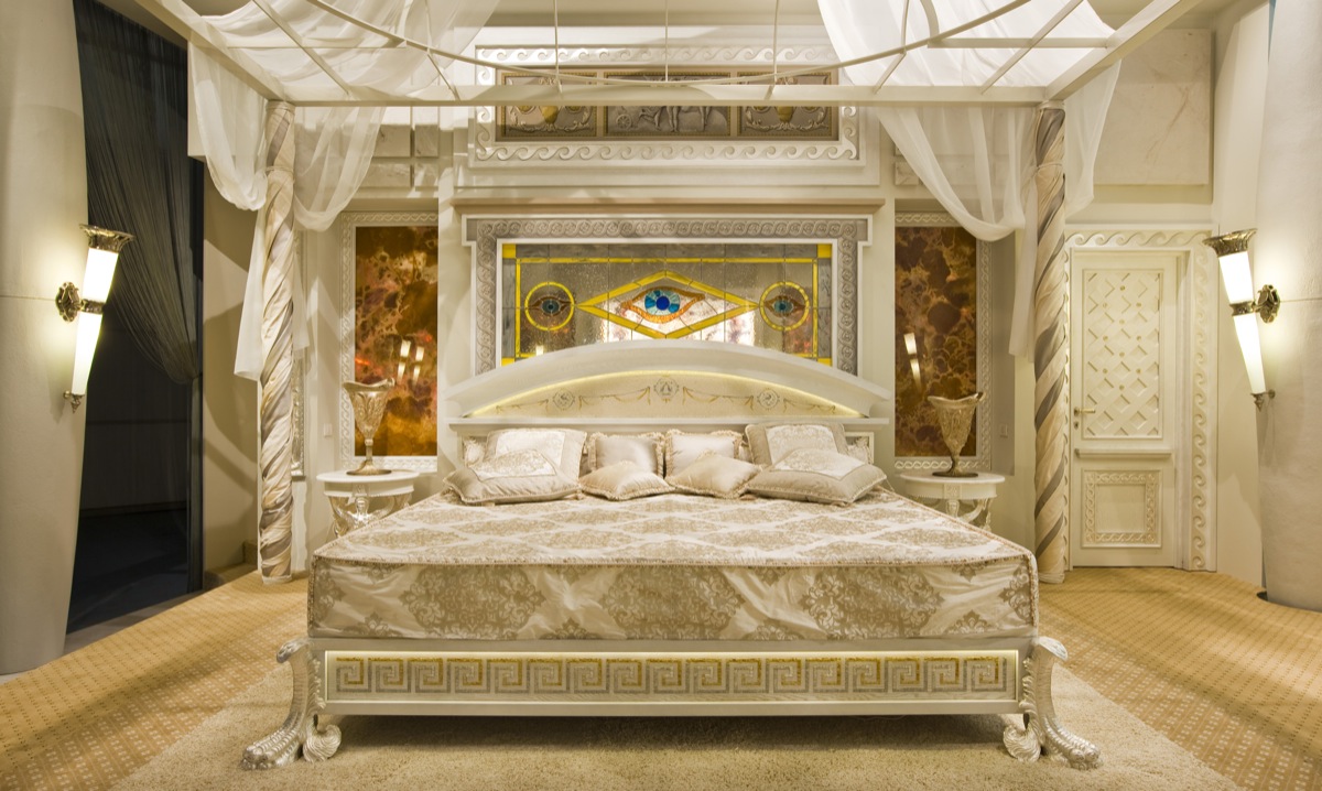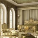 - Römische Architektur bedeutet, dass die Mitte des Raumes betont wird. Dies kann ein teurer Teppich oder Fliese mit antiken Ornament sein. Die Hauptsache ist die Aufrechterhaltung von Symmetrie und Zurückhaltung. Das Farbschema ist in hellen Farben vorzuziehen. Eine Fülle von Gold und Marmor ist willkommen. Die mehrgeschossige Decke im Schlafzimmer sollte der Kuppeldecke ähnlich sein, die die Architektur Roms betont.Der Raum sollte viel Licht haben, also müssen Sie neben dem zentralen Kronleuchter versteckte Lichter installieren. Sie werden die Illusion von Sonnenlicht erzeugen, das den Raum betritt.
