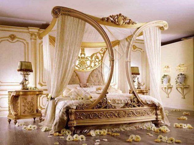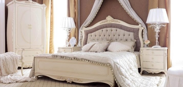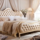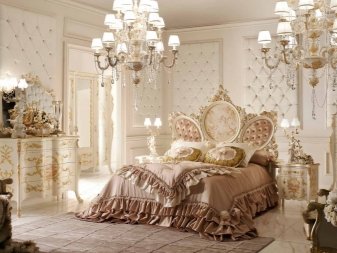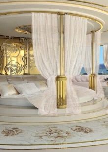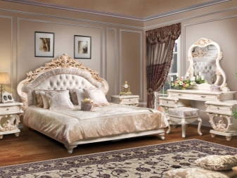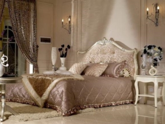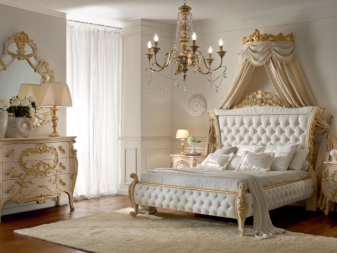Modulare Betten können mit Edelsteinen, Edelmetall-Einsätzen, einem Baldachin und gebogenen Kopfteilen dekoriert werden. Der Rest der Möbel ist ausgewählt und passt sich dem Bett an. Sie müssen mit ihr und Farbe und Design kombiniert werden.