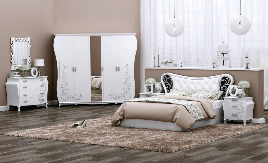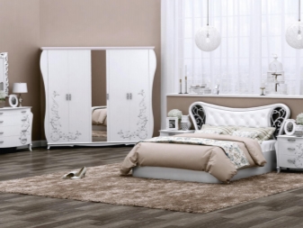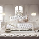 - "Stella" ist die Verkörperung des Neoklassizismus. Die russische Fabrik "Interdesign" hat ein weißes Schlafzimmer mit voluminösen Silbermustern geschaffen. Das Set besteht aus einem weißen weichen Bett, einem geräumigen Schrank und einer Kommode.