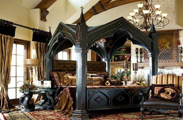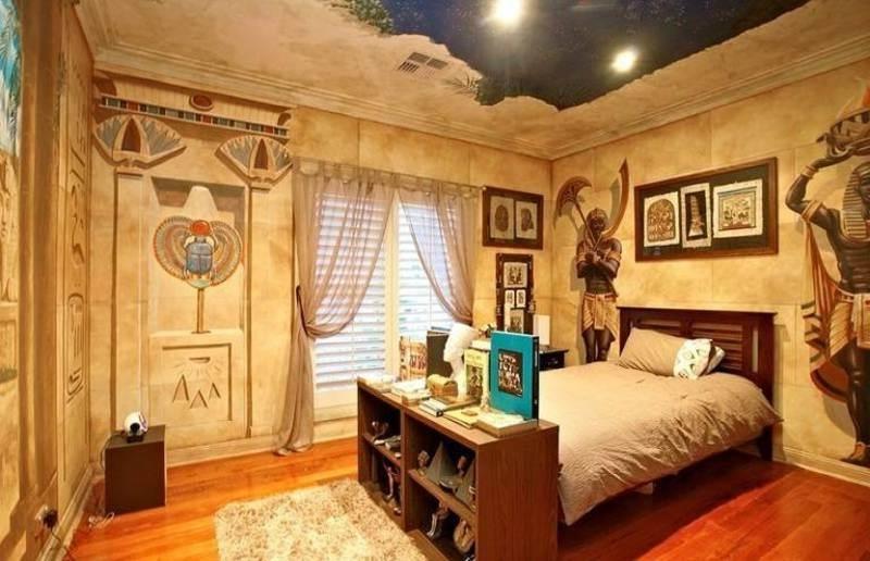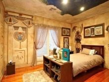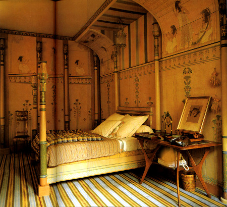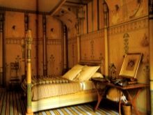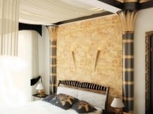 Möbel in ägyptischer Richtung sollten groß sein. Ein geräumiges und massives Bett sollte mit einem Baldachin mit Säulen geschmückt werden. Alle Polstermöbel müssen mit Leder bezogen sein, aber Stammesmöbel sind nicht verboten. Ergänzend wird das Schlafzimmer der alten Truhe mit einem voluminösen Schloss helfen.
