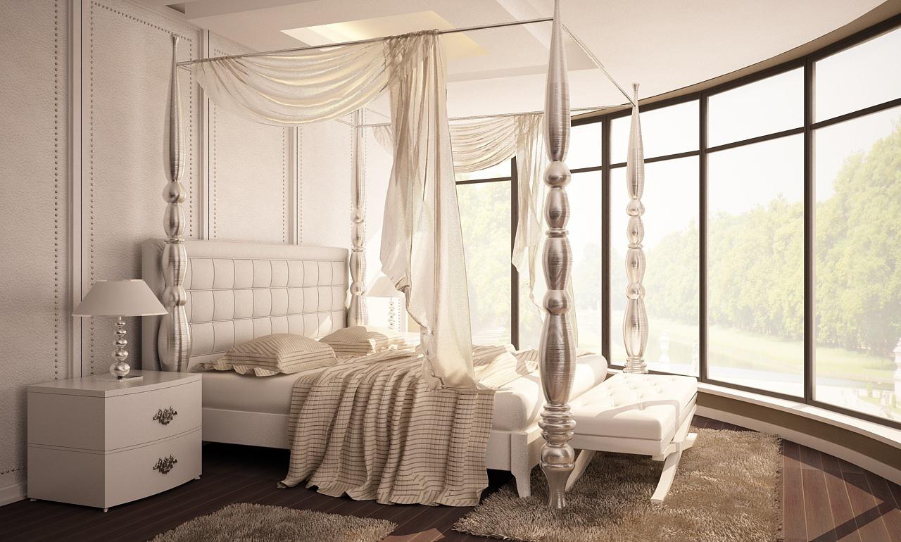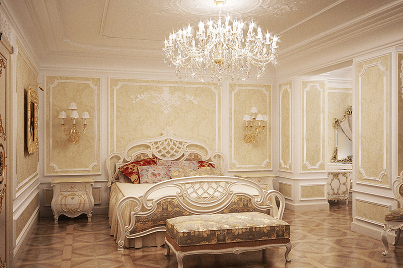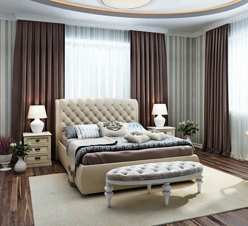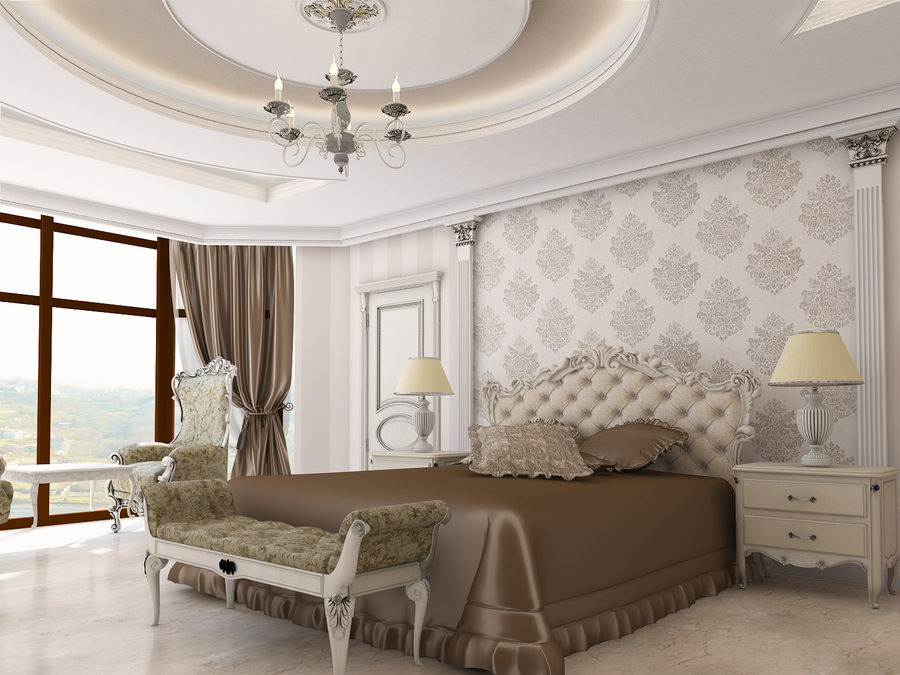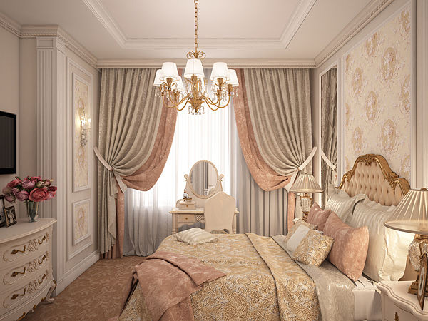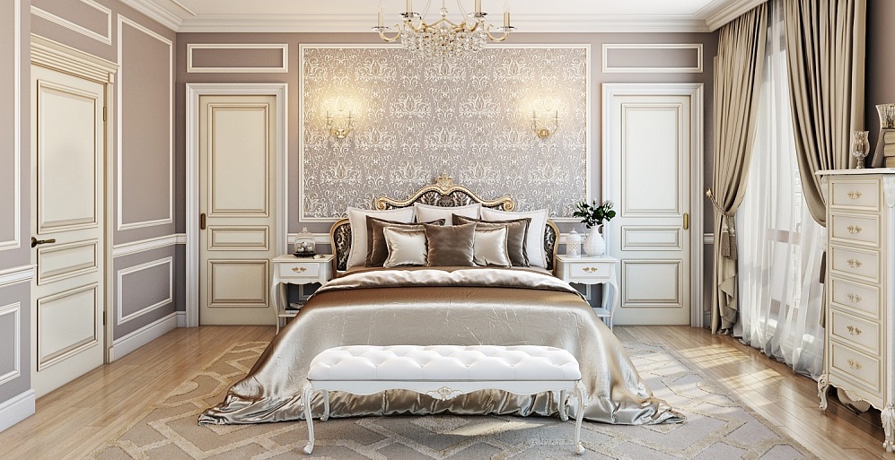 Finishing ist die Hauptsache in einem klassischen Stil. Wie die Schlafzimmeroberflächen gestaltet werden, hängt vom richtigen Eindruck und Gefühl ab.