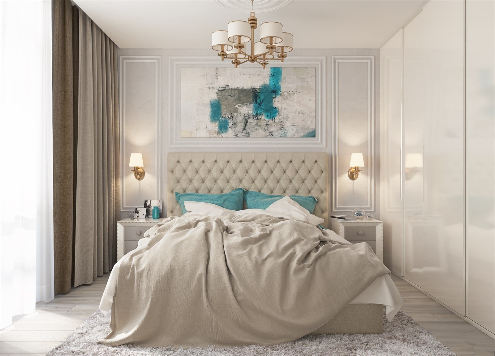 Wenn das Schlafzimmer klein ist, sollten Sie es nicht mit einer Fülle von Möbeln und Accessoires erzwingen. Classics setzt Raum und Freiheit voraus, daher ist es durchaus möglich, sich auf ein Bett, einen Kleiderschrank und Nachttische zu beschränken. Und wenn in einem kleinen Raum kein Platz mehr ist, dann können Sie ohne Nachttische auskommen und von einer kleinen Kommode wechseln.