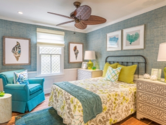 Das Meeresbild schafft an sich eine Gemütlichkeit und eine einfache Umgebung. Fast immer wird Türkis verwendet, um das Interieur in Schattierungen von Wasser zu schaffen, es bildet eine harmonische Atmosphäre im Raum.