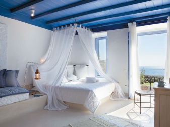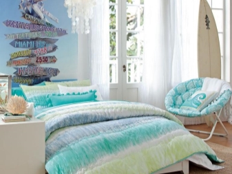 Die harmonische Kombination von gleichmäßigen und ruhigen Farben wirkt sich positiv auf die psychische Verfassung der Besitzer des "Meeres" -Schlafzimmers aus. Eine einfache Einrichtung ermöglicht es Ihnen, das Interieur elegant und charismatisch, hell und modisch zu dekorieren, während Sie das geringste Geld ausgeben.