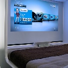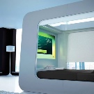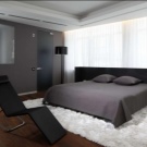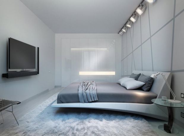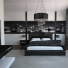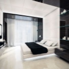 Im Schlafzimmer, gestaltet im Design innovativer Technologien, herrschen klare Linien, Geschlossenheit und Zurückhaltung.Dekorative Elemente werden praktisch nicht zur Dekoration des Raumes verwendet, und wenn sie noch im Innenraum vorhanden sind, aber in kleinen Mengen. Dies kann ein Foto in einem Metallrahmen oder eine Vase einer strengen Form sein.