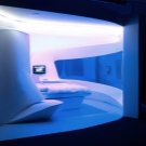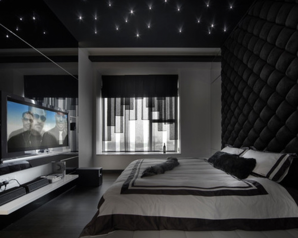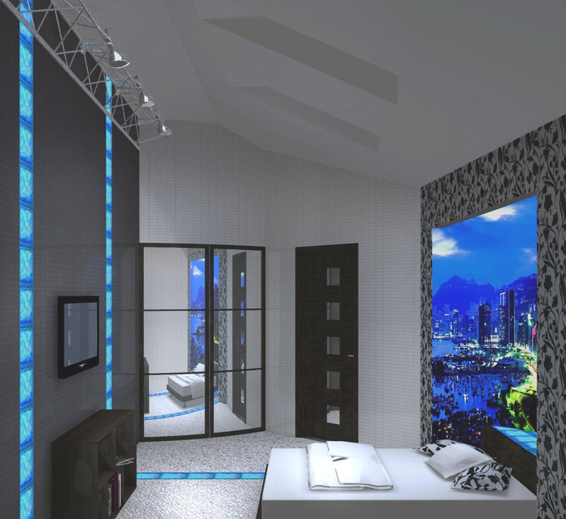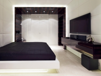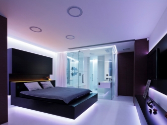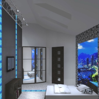 Glatte Linien, geometrische Figuren herrschen vor. Dies ist sowohl in der Gestaltung der Wände, der Decke, des Bodens und in den Möbelstücken lesbar. Abgerundete Formen, Schnörkel und so weiter sind Stilfremd. Vergessen Sie nicht das Hauptmerkmal - High-Tech. Plasma-TV, Neonröhren, modernes Audiosystem in den Wänden des Raumes.