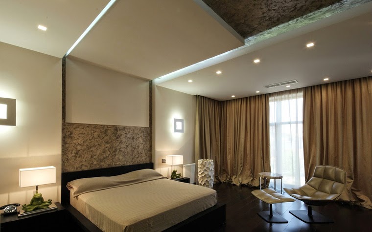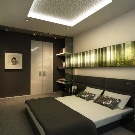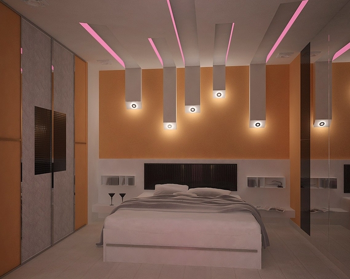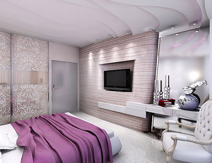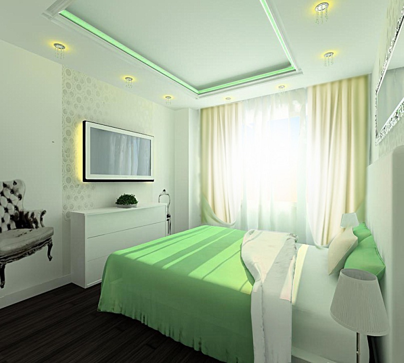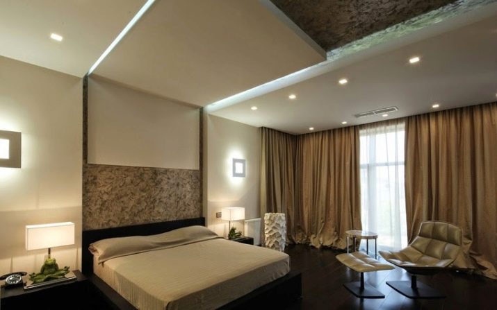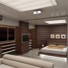 Diese Art von Deckenkonstruktion ist perfekt für kompakte Räume. Das Material, das für abgehängte Decken verwendet wird, reflektiert das Licht und macht den Raum optisch größer und geräumiger. Eine glatte reflektierende Leinwand, um die herum die Deckenleuchten angebracht sind, schmückt den Raum, der Aufmerksamkeit erregen wird.