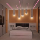 Für moderne "Hi-Tech" sind Strahler, die in Möbelstücke, Boden oder Decke eingebaut sind, perfekt. Ein flacher Kronleuchter, der standardmäßig in der Mitte platziert wird, passt perfekt in den Innenraum. Designer weisen darauf hin, dass Halogen- oder Lichterketten auch perfekt mit dem obigen Stil harmonieren.Ihre Anzahl hängt von der Größe des Zimmers sowie von der Farbgebung ab, in der das Zimmer eingerichtet ist.