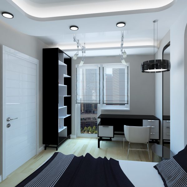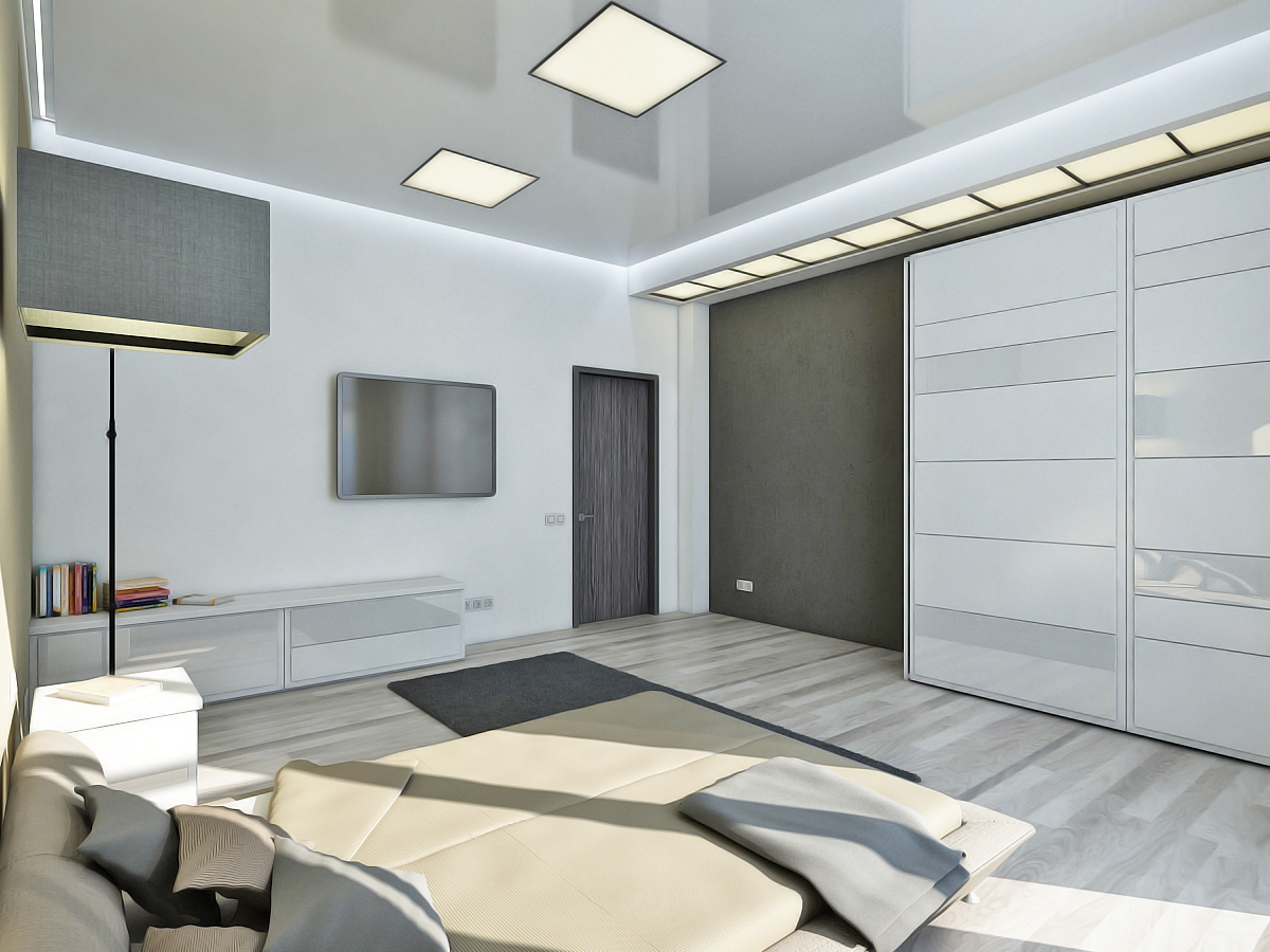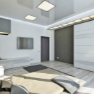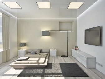 Für die oben genannte Dekoration ist eine perfekte Spanndecke. Seine glatte glänzende Oberfläche ist ideal für High-Tech. Experten empfehlen, sich für einen silbermetallischen Farbton zu entscheiden.Auch im Design passen perfekt klassische Farboptionen: Schwarz und Weiß.