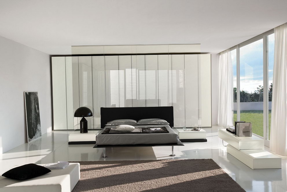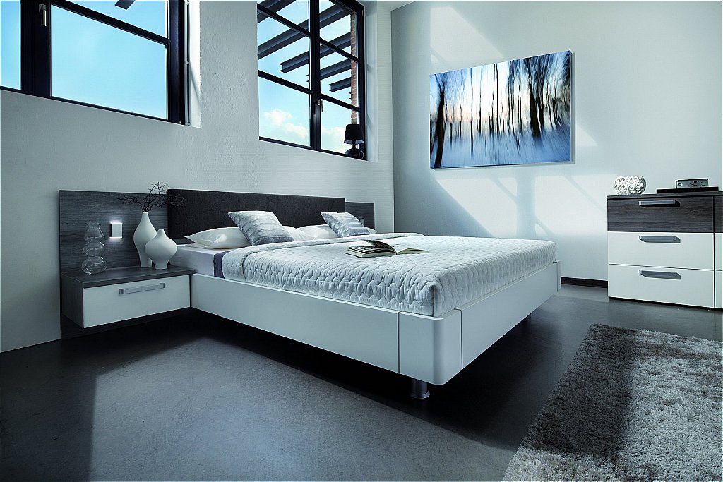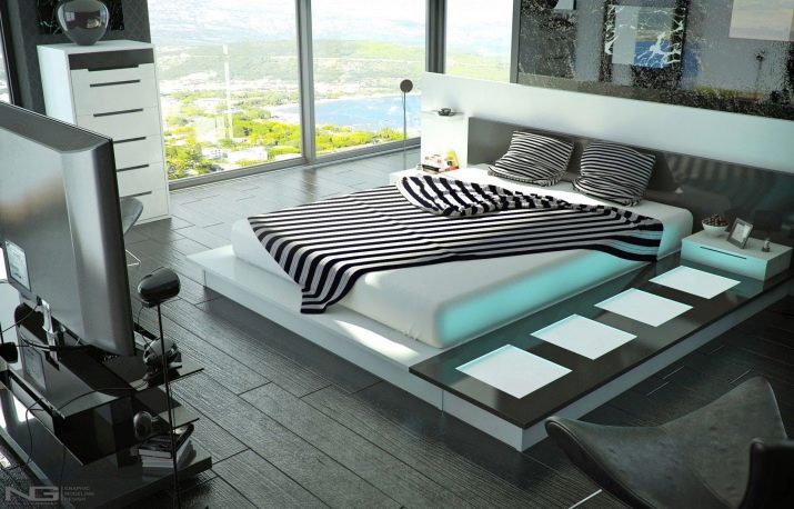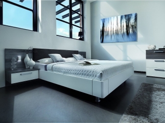 Das Hauptmöbelstück ist ein Bett in einer strengen geometrischen Form. Ein beleuchtetes Modell (dies wird eine Atmosphäre des Futurismus geben), eine verstellbare Rückenlehne und geräumige Schubladen für Bettwäsche und Kleidung sind perfekt für die oben genannten Stilistiken.Das Bett sollte nicht nur stilvoll und für ein bestimmtes Design geeignet, sondern auch bequem sein.