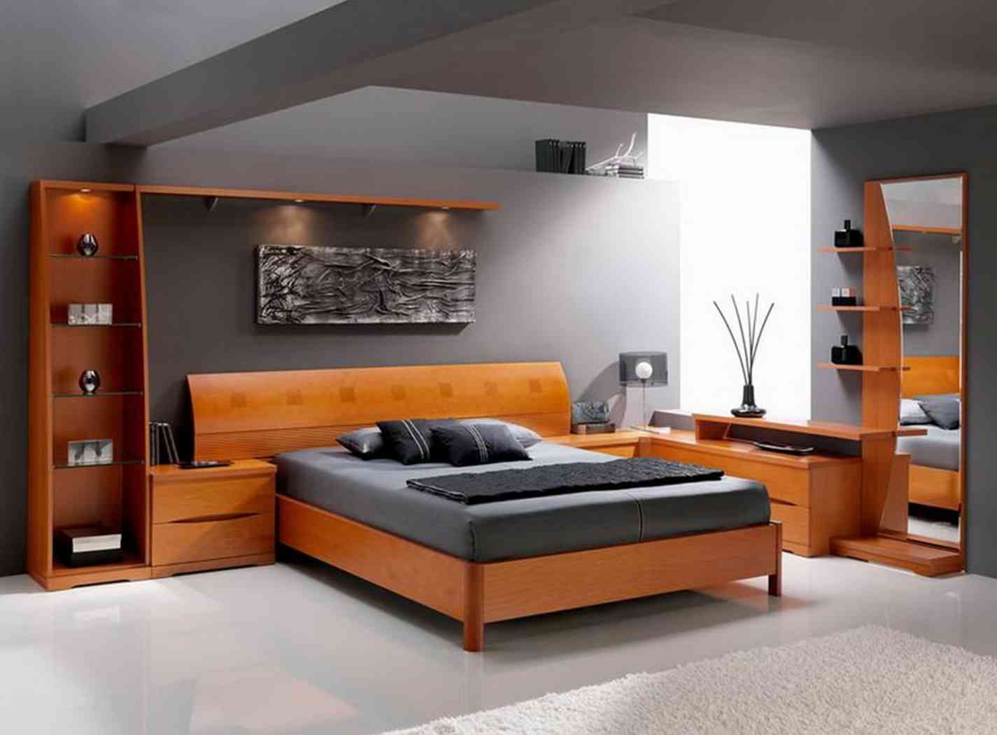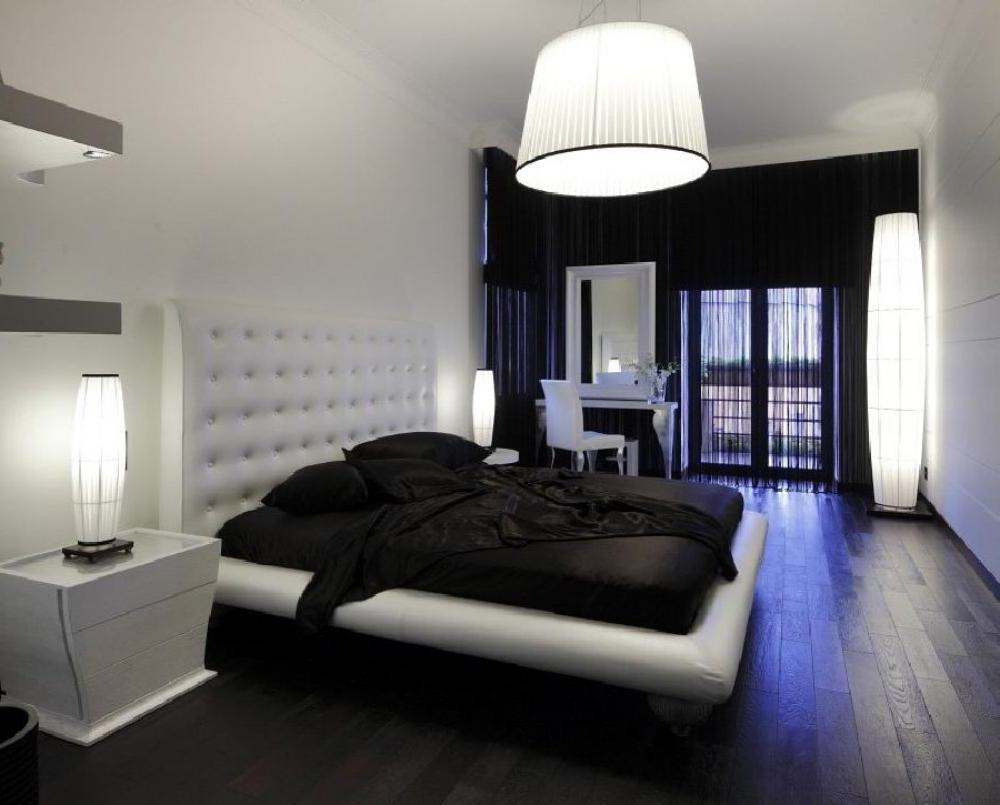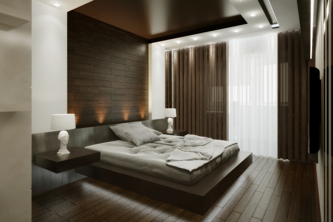 Designer merken an, dass natürliche Beläge verwendet werden können, um das Schlafzimmer zu dekorieren. Fit breite Bretter mit einem natürlichen Schatten. Wenn Sie planen, Laminat zu kaufen, ist es empfehlenswert, sich für ein glänzendes in kalten und zurückhaltenden Farbtönen zu entscheiden.