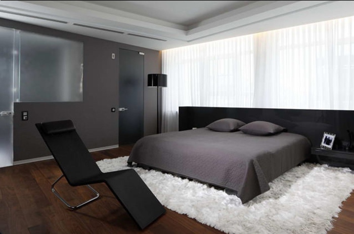Für den Boden im Schlafzimmer im Stil von "High-Tech" können Sie jedes beliebige Material wählen. Hauptsache, es erfüllt bestimmte Anforderungen: