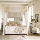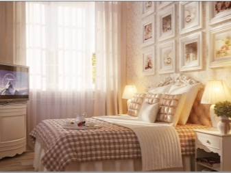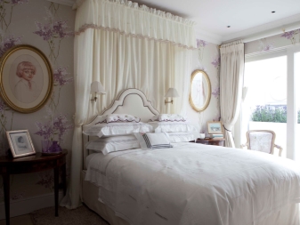 Wenn es um das Schlafzimmer geht, ist das Zentrum der Zusammensetzung normalerweise das Bett. Es sollte groß, groß und bequem sein. Es kann perfekt mit einem Baldachin oder einem Baldachin aus hellen, hellen Stoffen ergänzt werden. Leider ist es nicht immer möglich, diese Idee in modernen Standardwohnungen zu verkörpern.