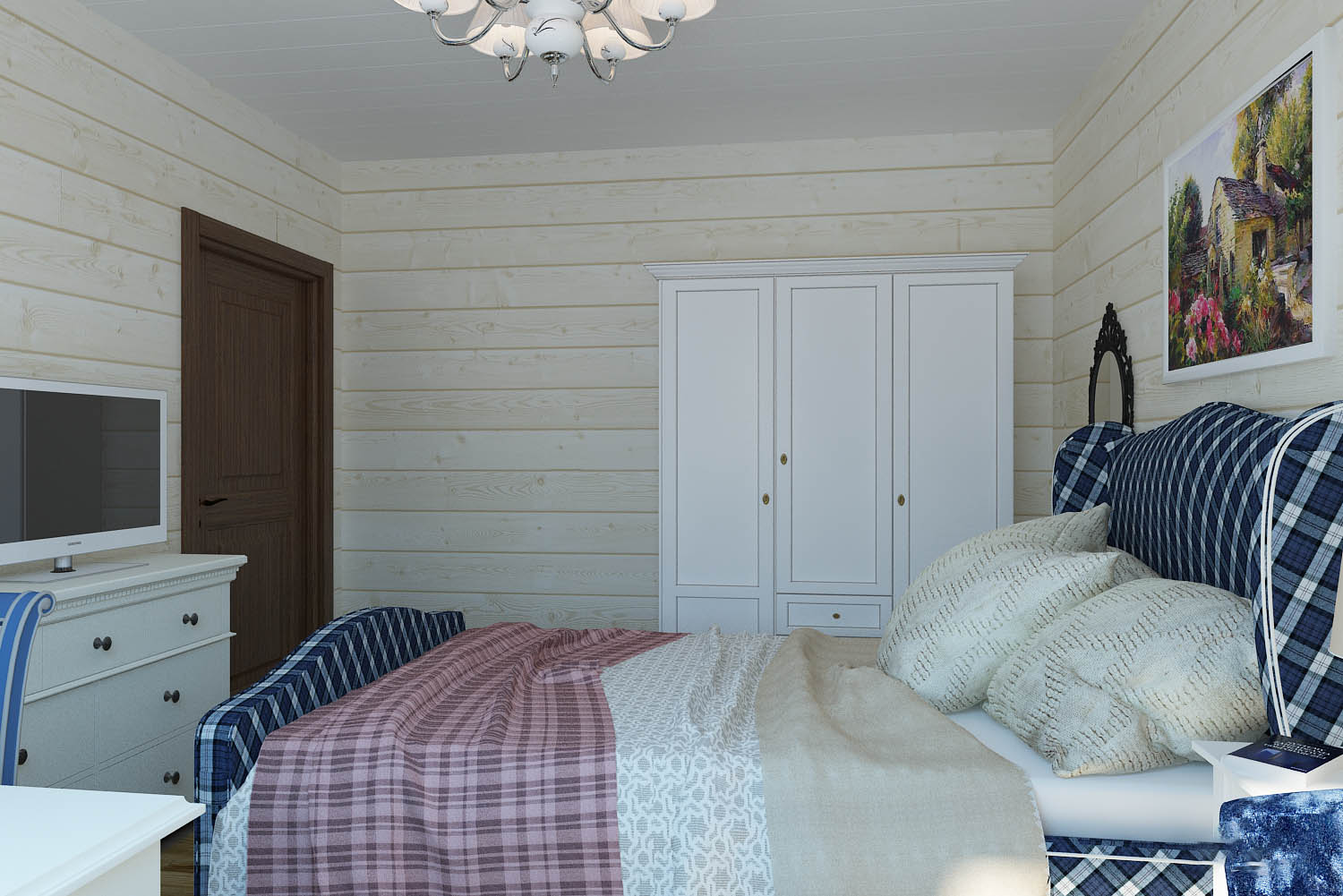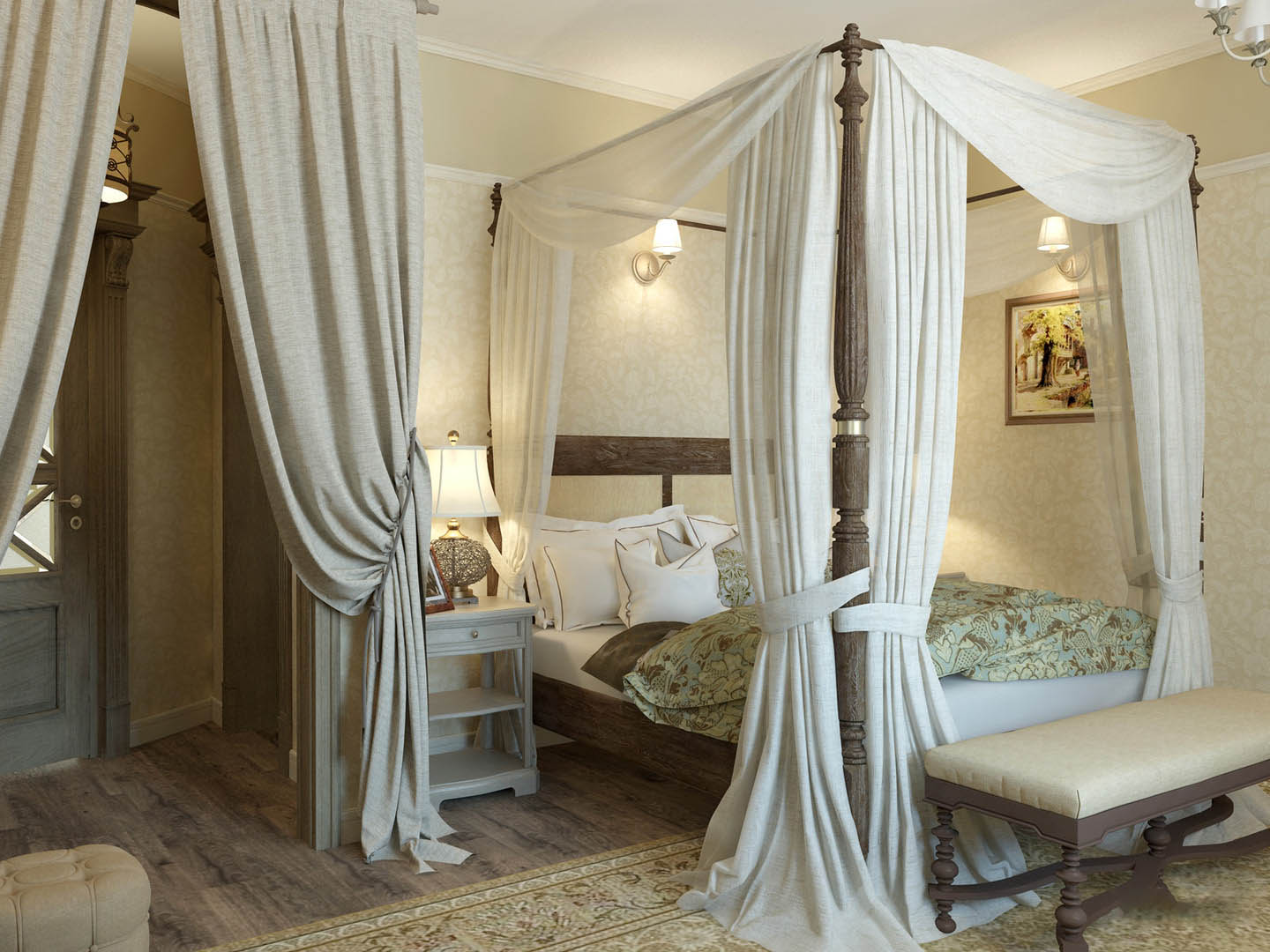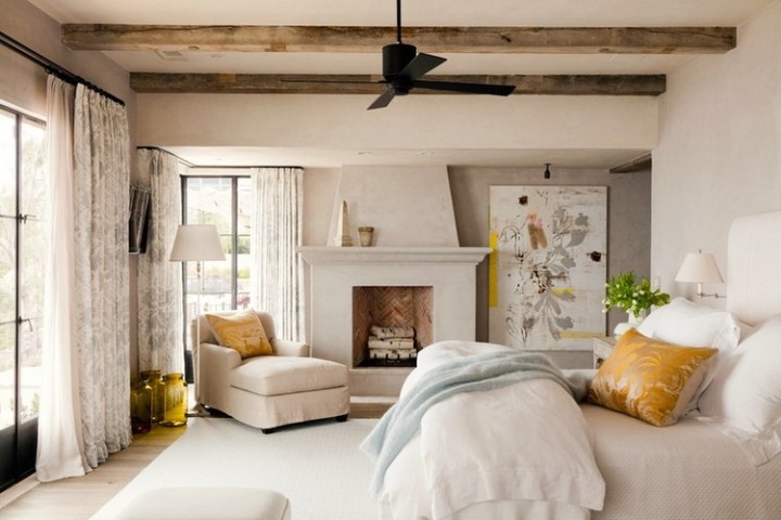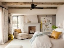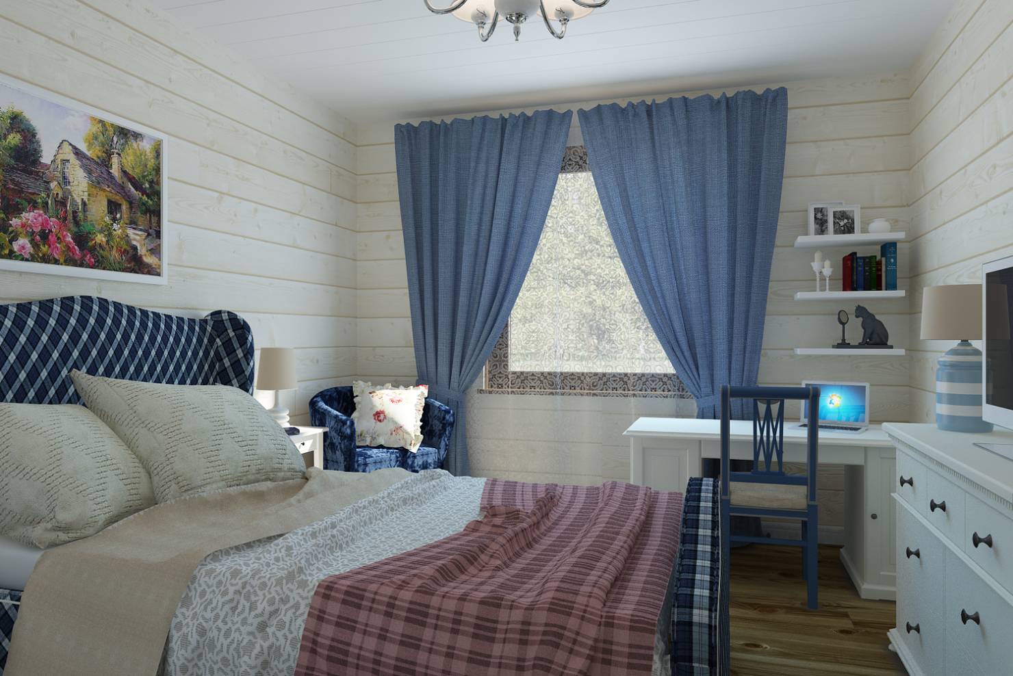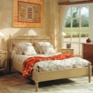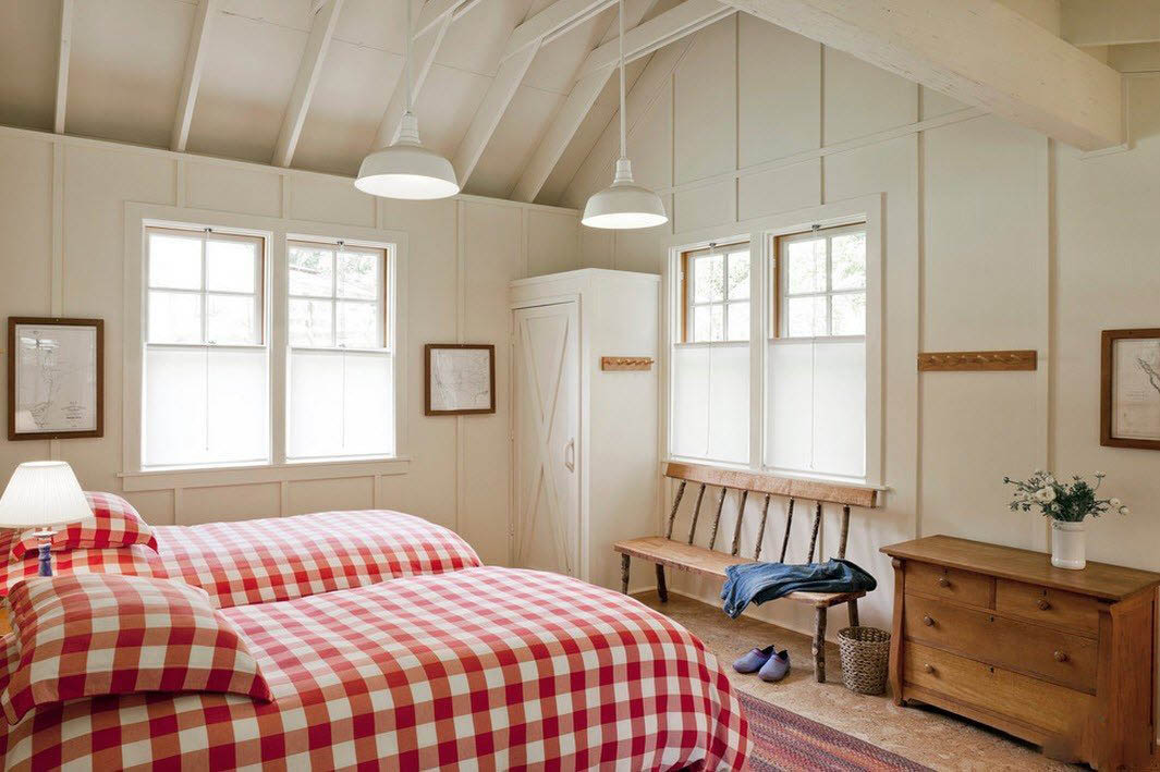 Balkendecke ist ideal in diesem Interieur. Die Lampe sieht sehr schön aus, der Stoff der Lampenschirme fällt mit dem Kopfteil zusammen. Der Boden besteht aus leicht gestrichenen Brettern und ist mit einem Teppich verkleidet, der sich nicht vom Gesamtbild abhebt.
