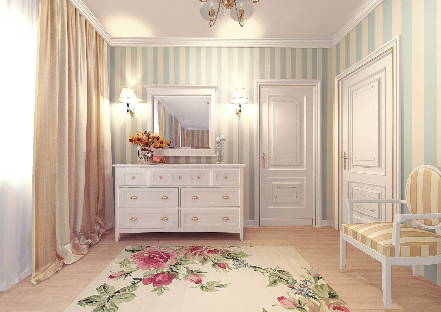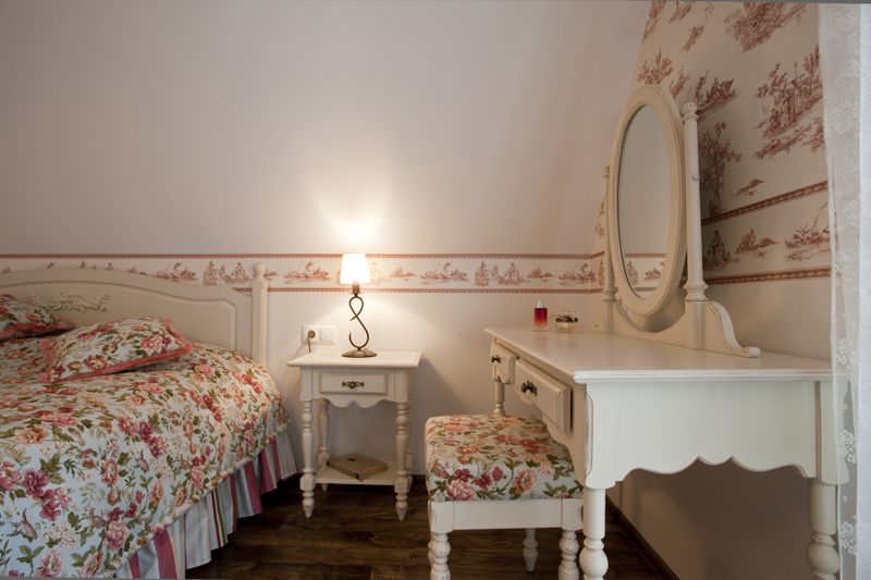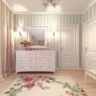 Kommoden, Tische und Schränke sollten elegant sein, auf dünnen geschwungenen Beinen.Antike Möbel oder Möbel mit Antik-Effekt werden zu diesem Interieur passen. Da solche Räume meist für weibliche Personen oder Paare vorgesehen sind, kann ein Frisiertisch im Raum aufgestellt werden.