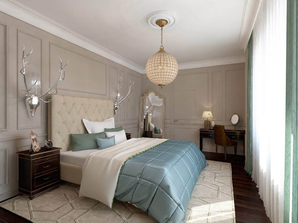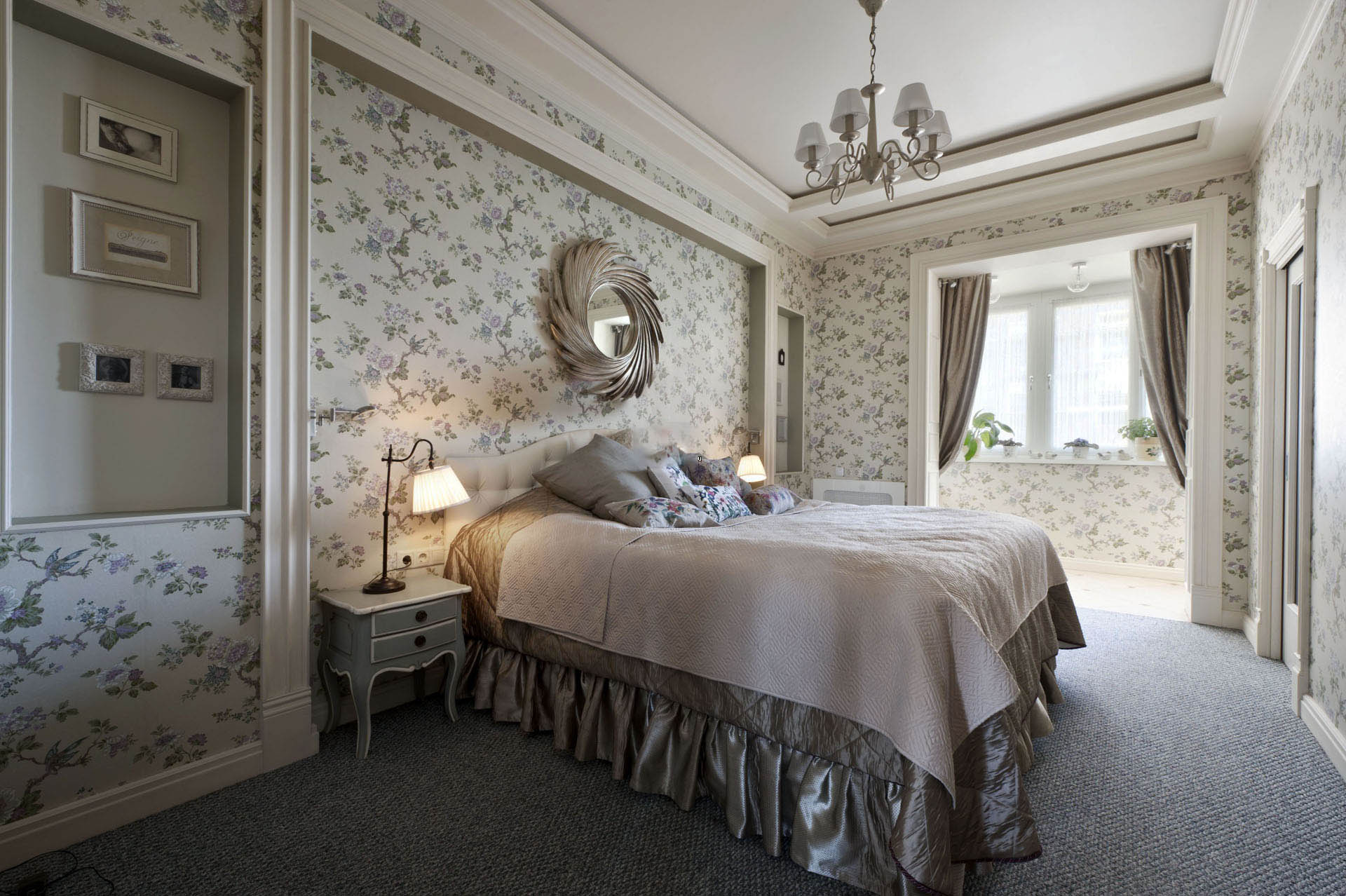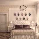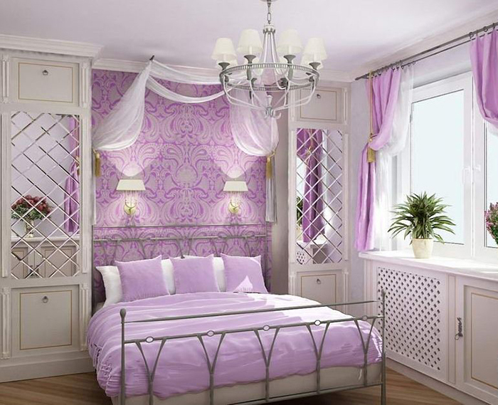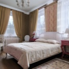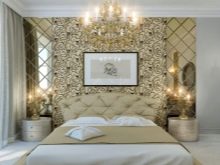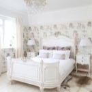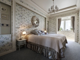 Ein Bett eines vereinfachten klassischen Modells in Kombination mit Tapeten mit Blumenmuster wird moderner aussehen. Sie können einen symmetrisch modularen Kleiderschrank arrangieren, der über dem Bett platziert wird. Einfache geometrische Formen und das Vorhandensein einer Achse, um die die Komposition aufgebaut ist (in diesem Fall ein Bett), sind typisch für die Klassiker.