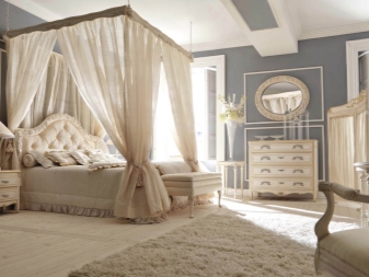 Der Rest der Möbel sollte nicht vom Bett ablenken. In der Nähe muss es Nachttische haben. Dieser Stil folgt getreu den Traditionen der Antike. Wenn Sie keinen zusätzlichen Speicherplatz benötigen, können Sie Modelle mit Schubladen ablehnen. Davon wird das Design profitieren.